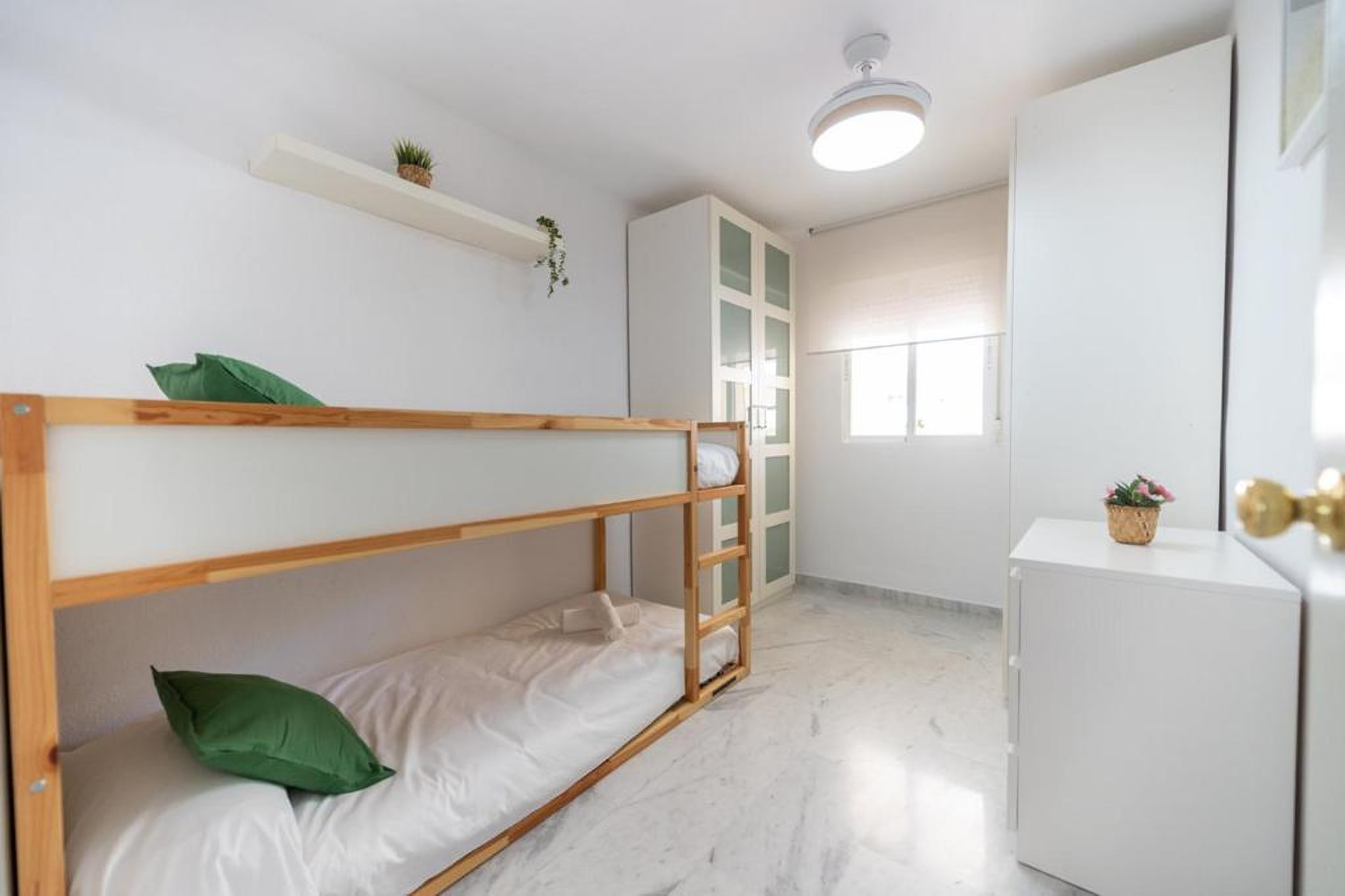 La vivienda dispone de tres habitaciones y tiene capacidad para hasta seis personas, lo que la convierte en una elección perfecta para familias o grupos de amigos. El apartamento está equipado con aire acondicionado y calefacción en el salón y ventiladores en las habitaciones, garantizando una estancia cómoda en cualquier época del año.