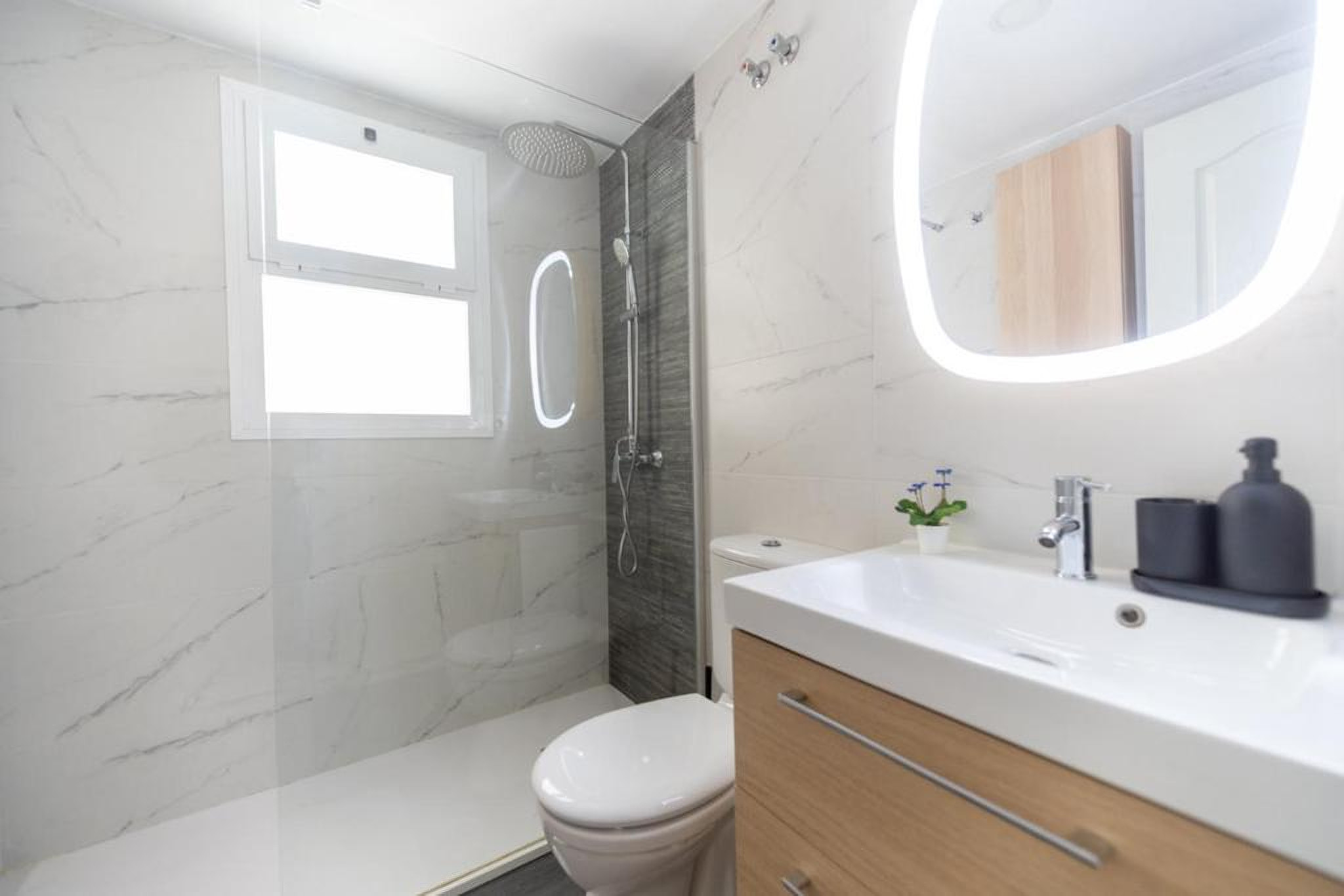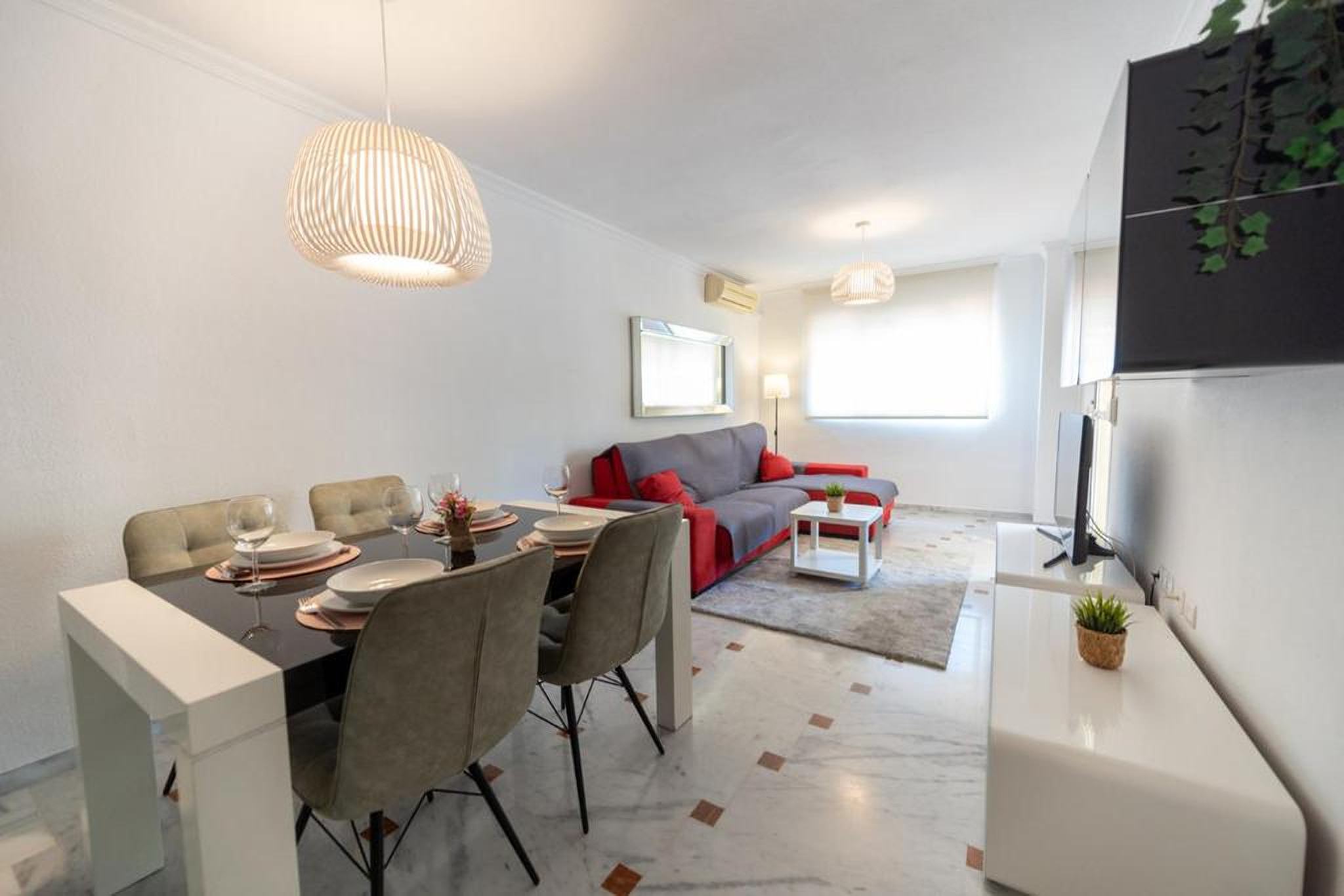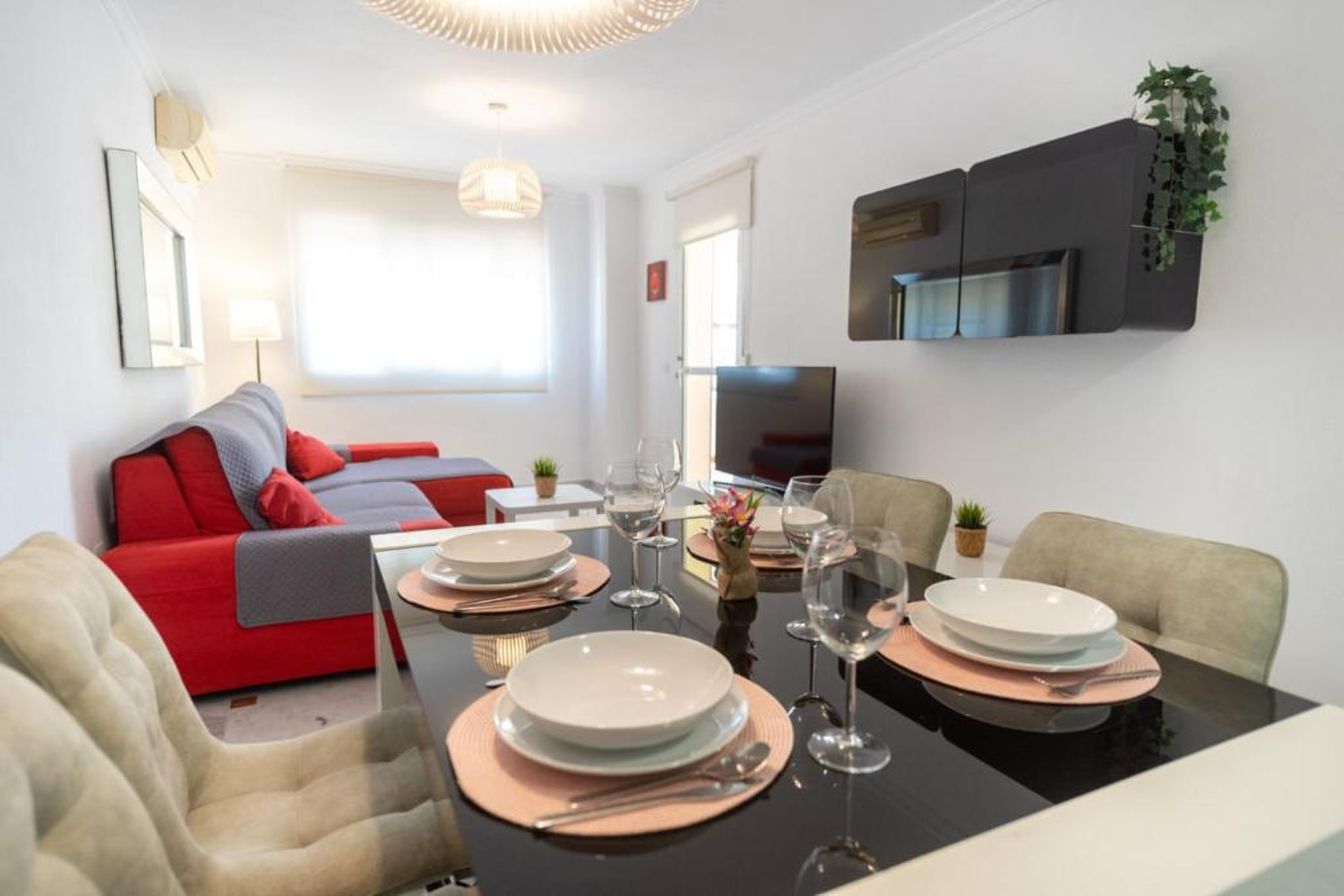 En el interior, el apartamento ofrece espacios pensados para el descanso y la convivencia. El salón, amplio y acogedor, es ideal para relajarse después de un día de playa o de turismo. Dispone de Wi-Fi gratuito, perfecto para quienes necesiten teletrabajar o mantenerse conectados durante su estancia. La cocina independiente está completamente equipada, facilitando la preparación de comidas en casa. El alojamiento cuenta con dos baños: uno en suite con bañera y un segundo baño con ducha, aportando funcionalidad y comodidad para grupos más numerosos.