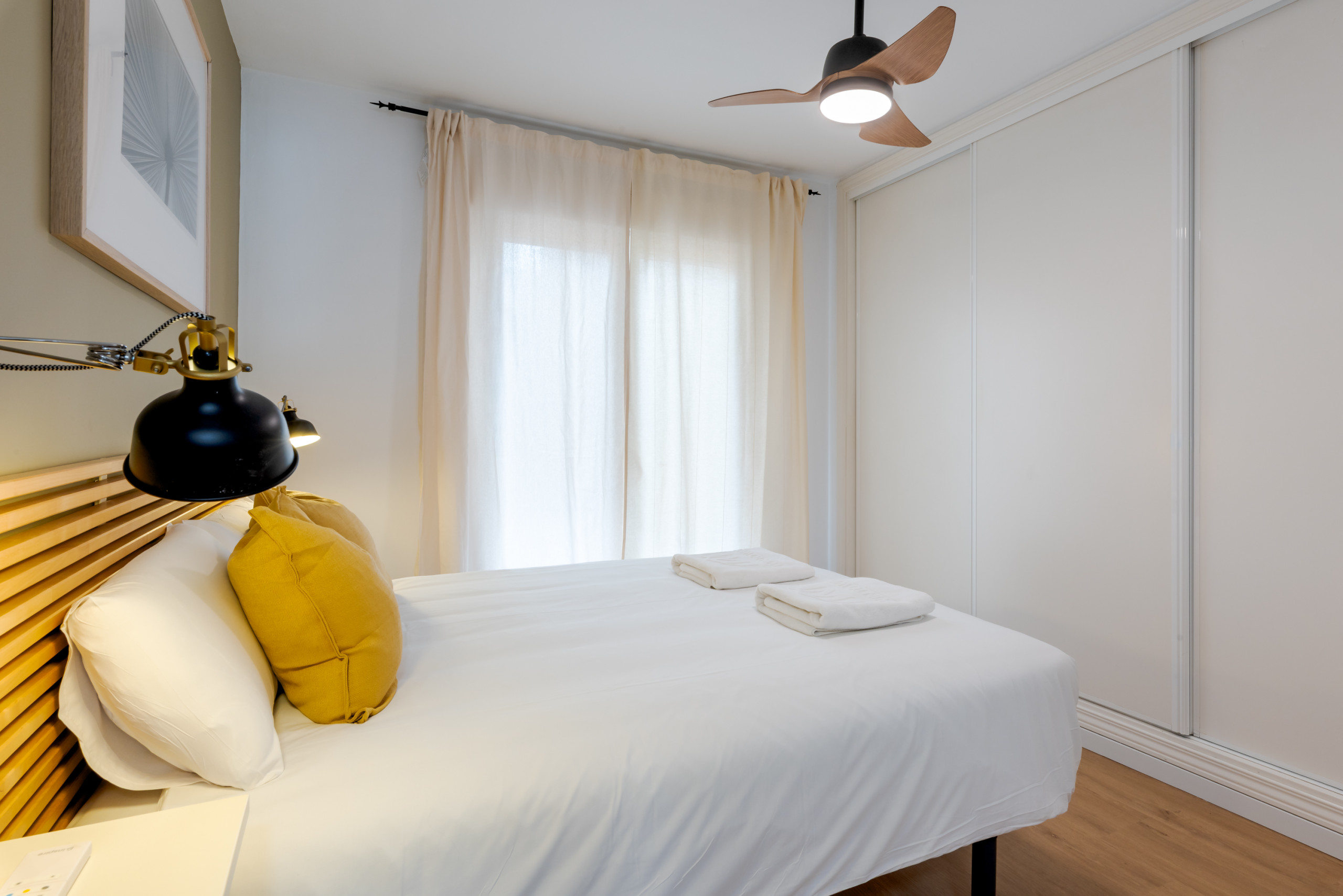 El apartamento cuenta con un dormitorio con cama doble, un luminoso salón comedor con decoración moderna y una cocina totalmente equipada con microondas, nevera, lavadora, cafetera, tostadora, hervidor y utensilios de cocina. Todo pensado para que te sientas como en casa.