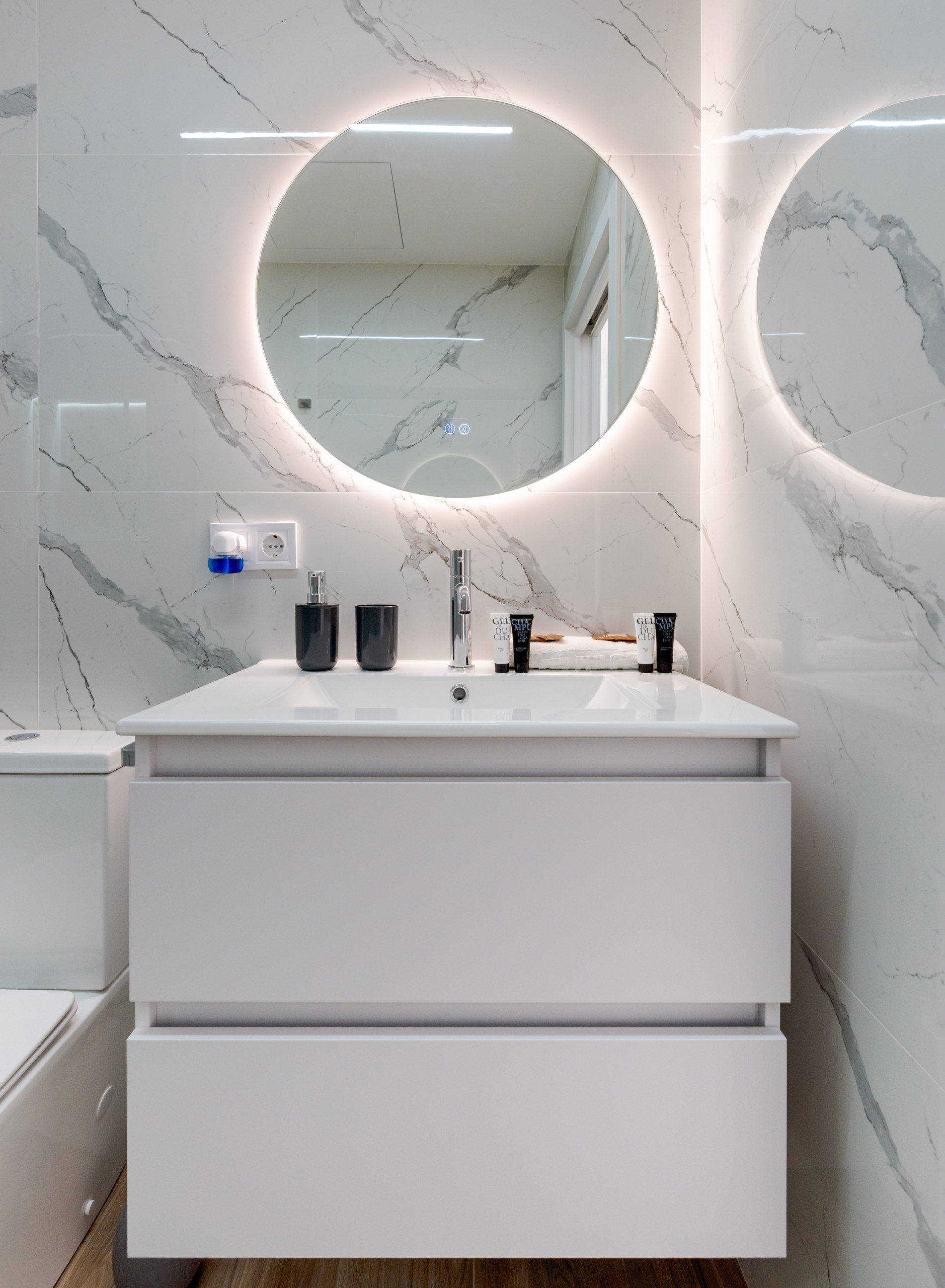 El apartamento cuenta con dos baños completos con ducha, ambos decorados con un estilo moderno, funcional y elegante.