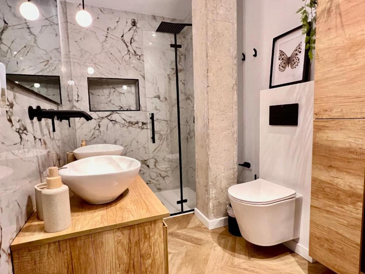 Se distribuye en dos cómodos dormitorios, ambos con cama de matrimonio, con capacidad para alojar hasta 4 personas, siendo ideal para familias, parejas o pequeños grupos de amigos. Dispone de un moderno y elegante baño, equipado con ducha a ras de suelo, grifería encastrada y una cuidada iluminación ambiente que aporta un toque de confort y sofisticación.