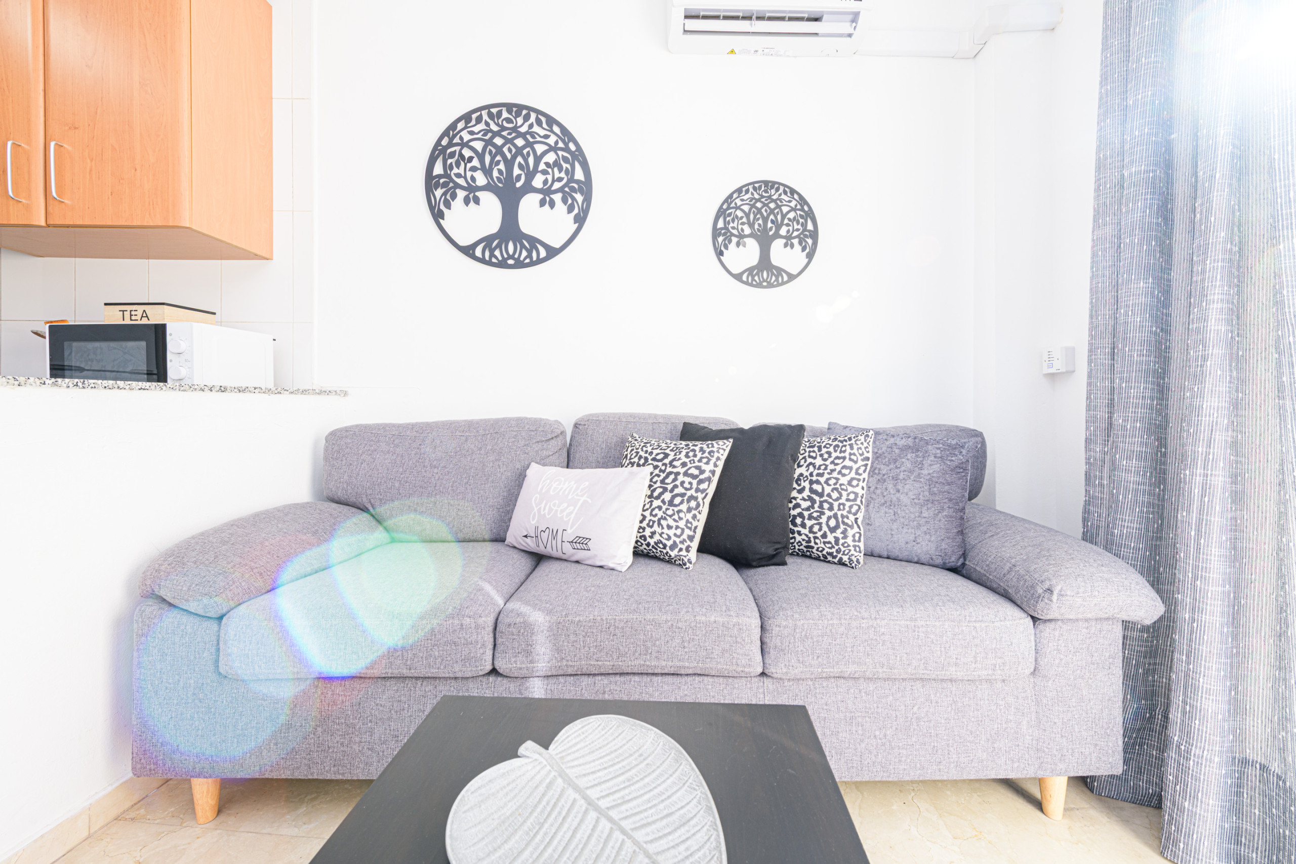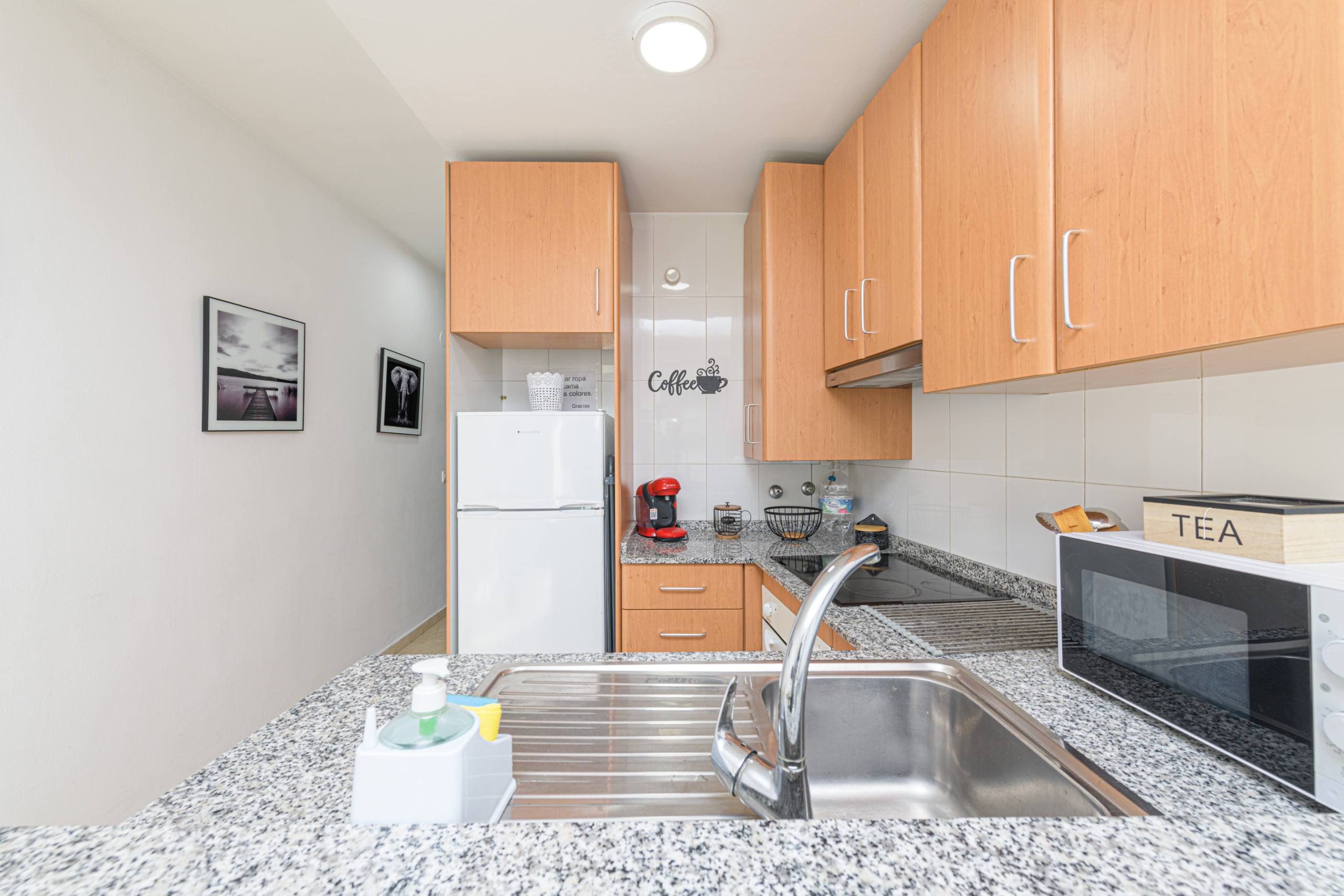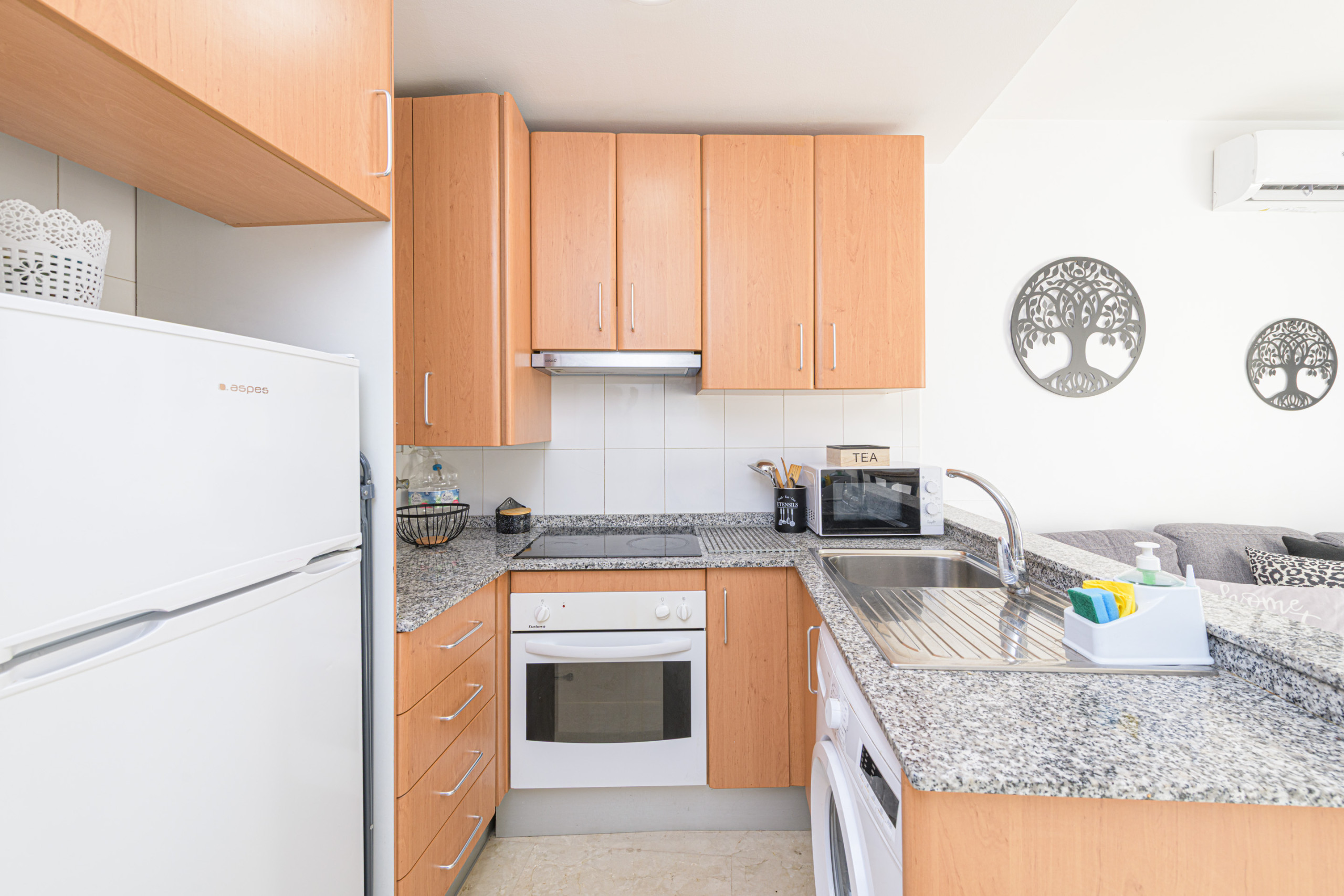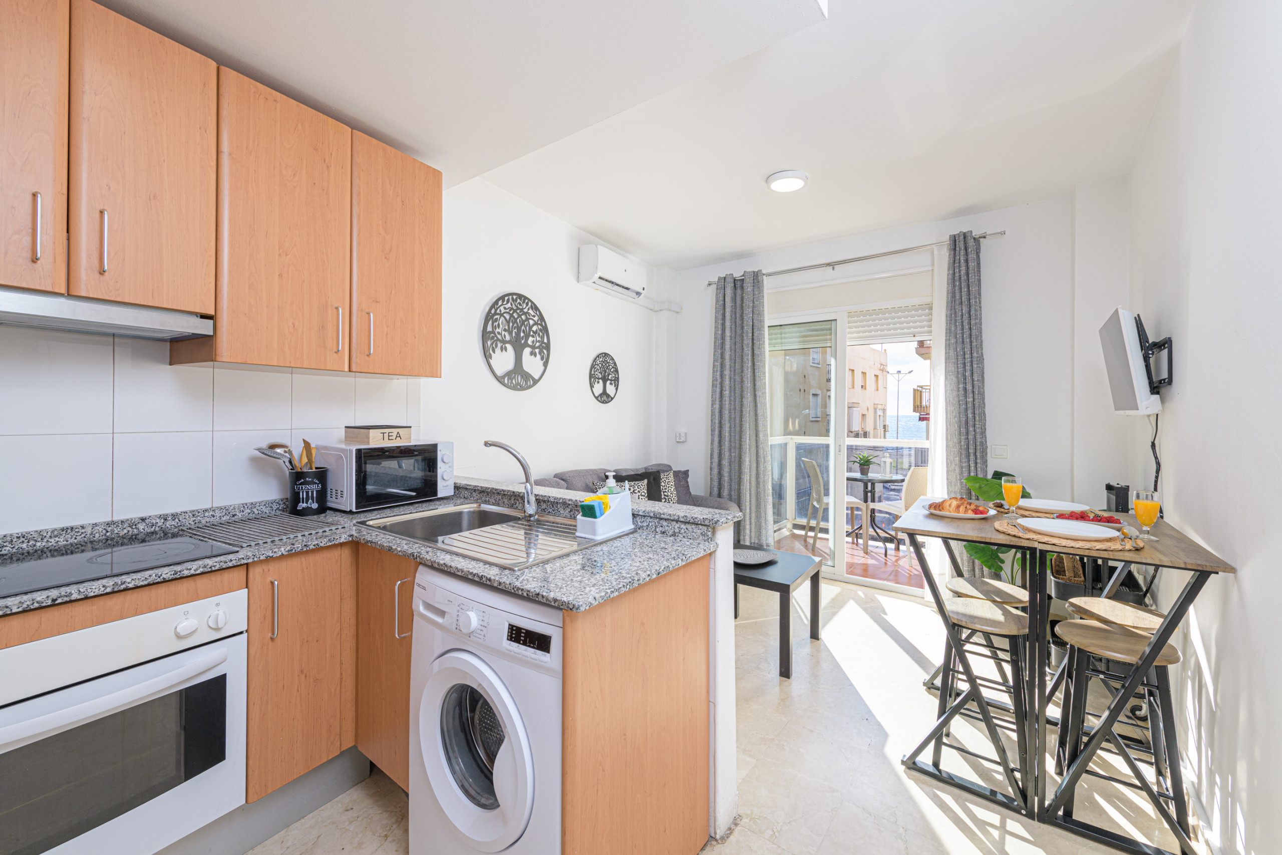 El apartamento dispone de un salón acogedor con Smart TV, conectado a una cocina americana totalmente equipada, dos dormitorios y un baño moderno con ducha. Desde el salón se accede a una coqueta terraza privada con ligeras vistas al mar, perfecta para relajarse después de un día de playa.