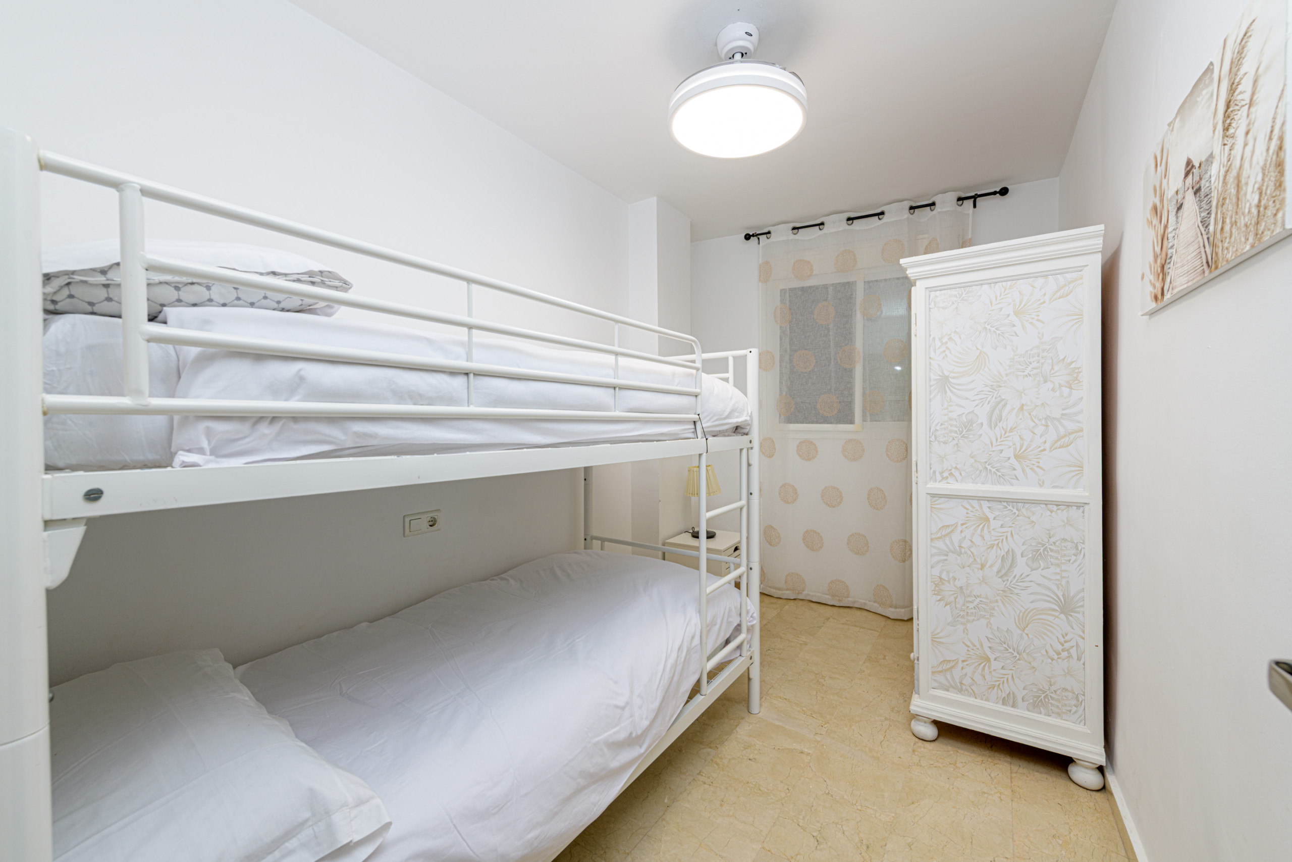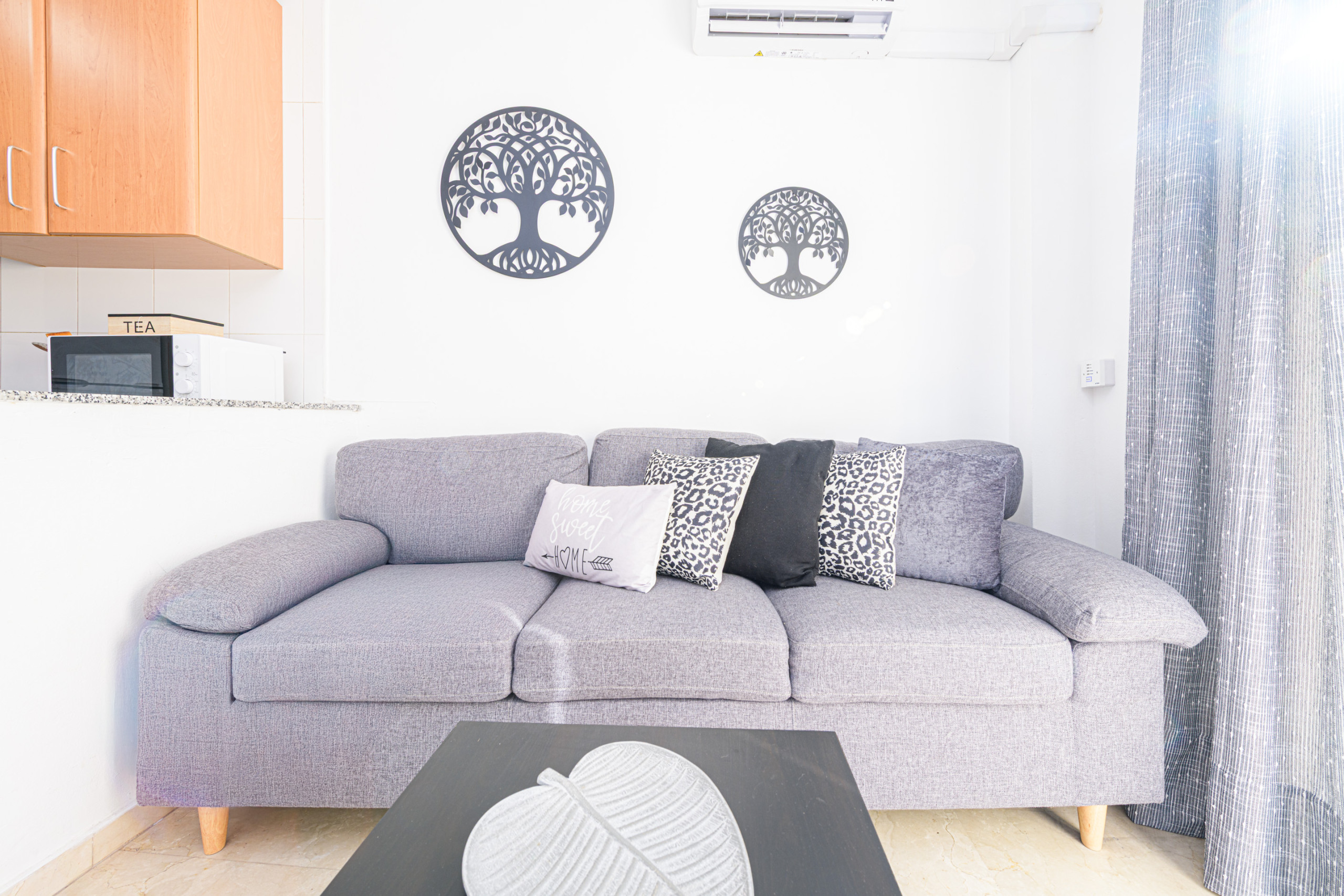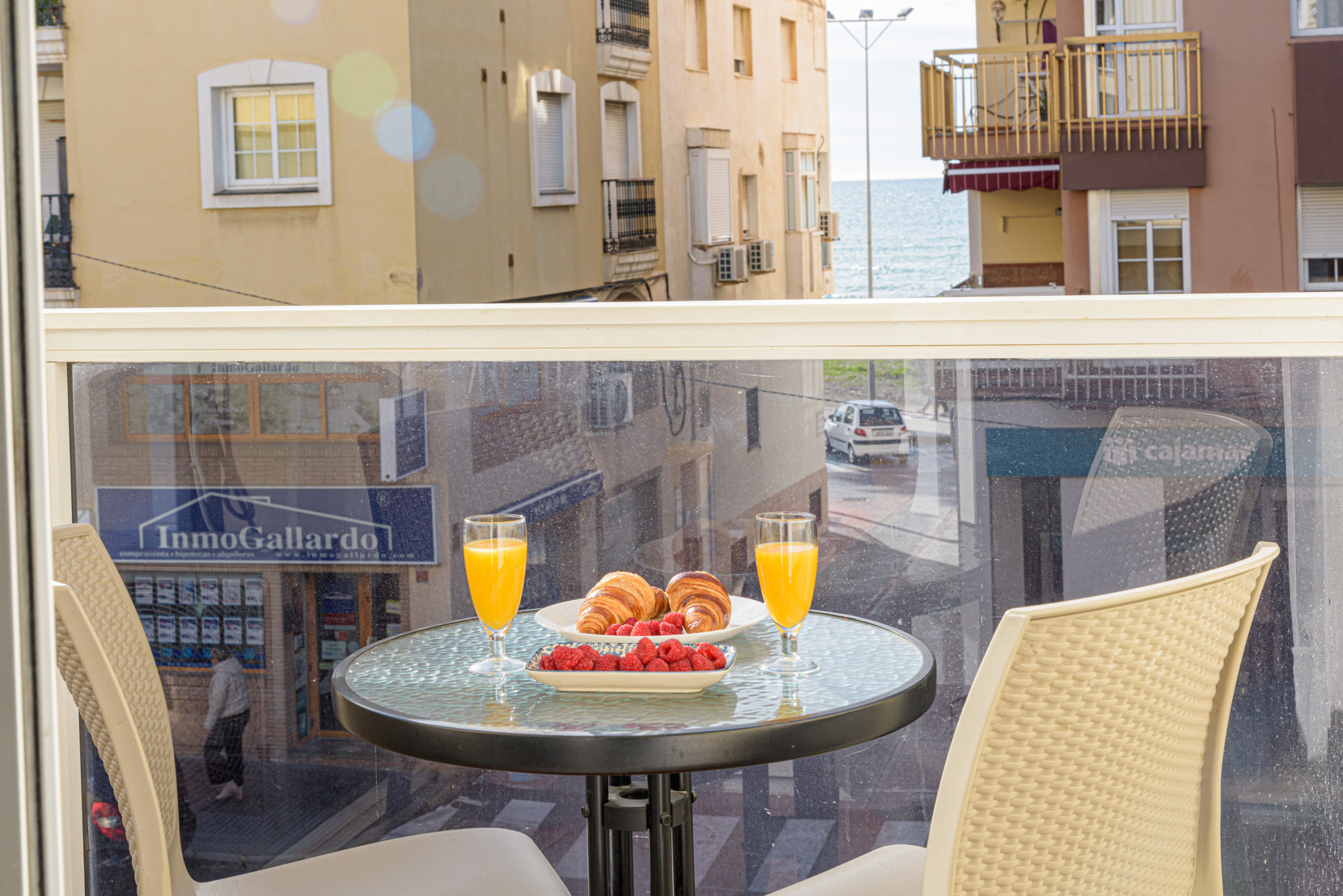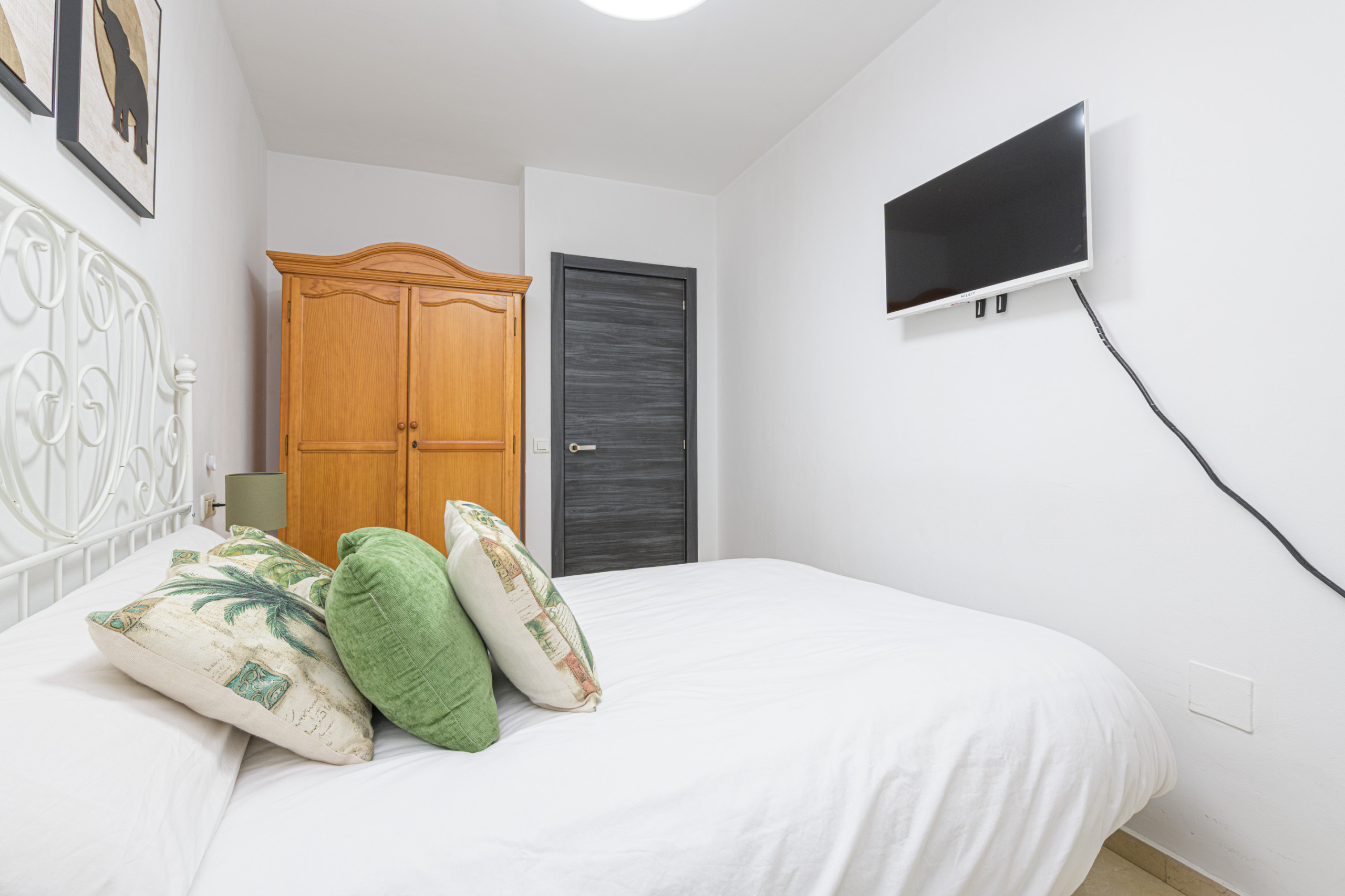El apartamento dispone de un salón acogedor con Smart TV, conectado a una cocina americana totalmente equipada, dos dormitorios y un baño moderno con ducha. Desde el salón se accede a una coqueta terraza privada con ligeras vistas al mar, perfecta para relajarse después de un día de playa.