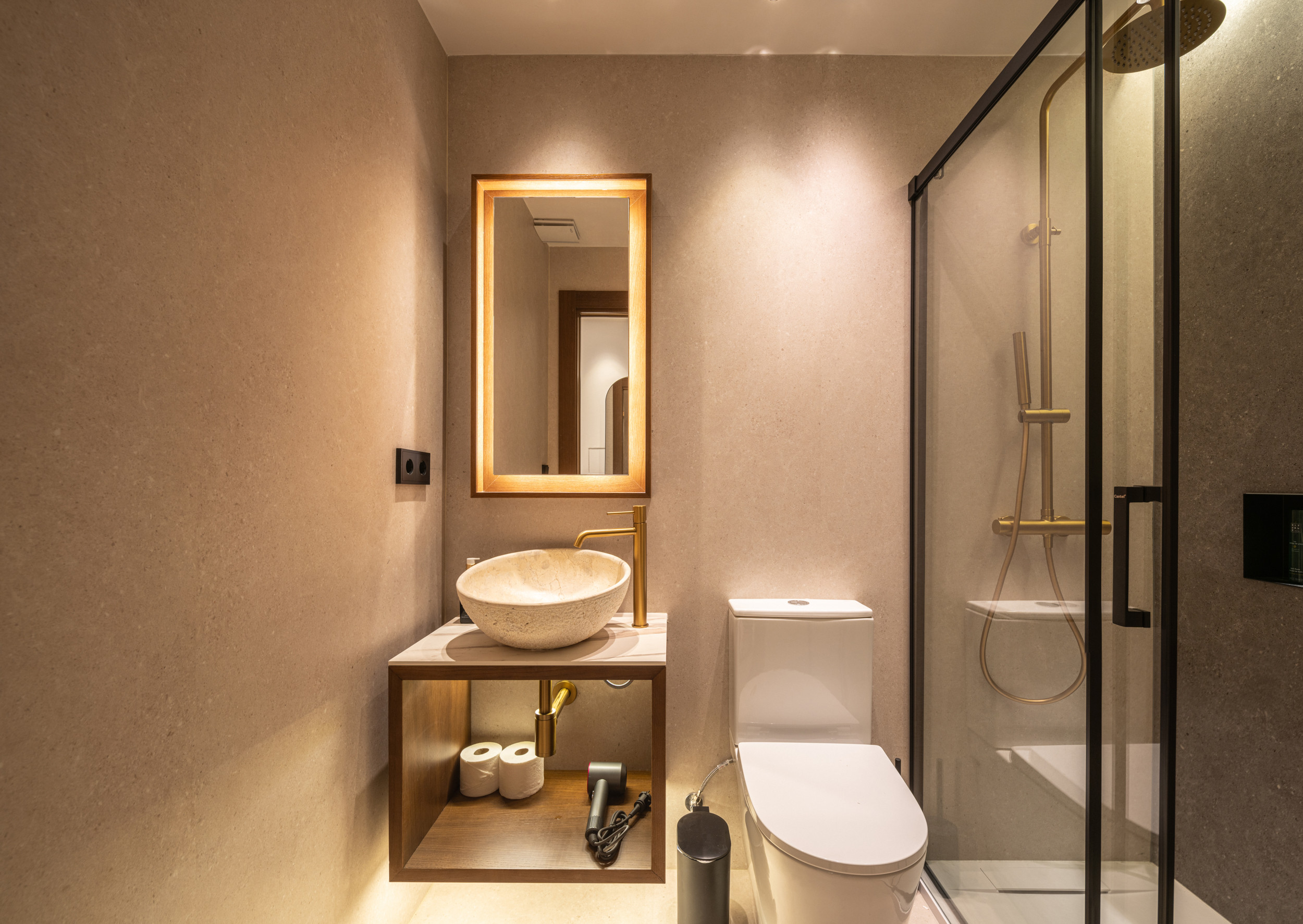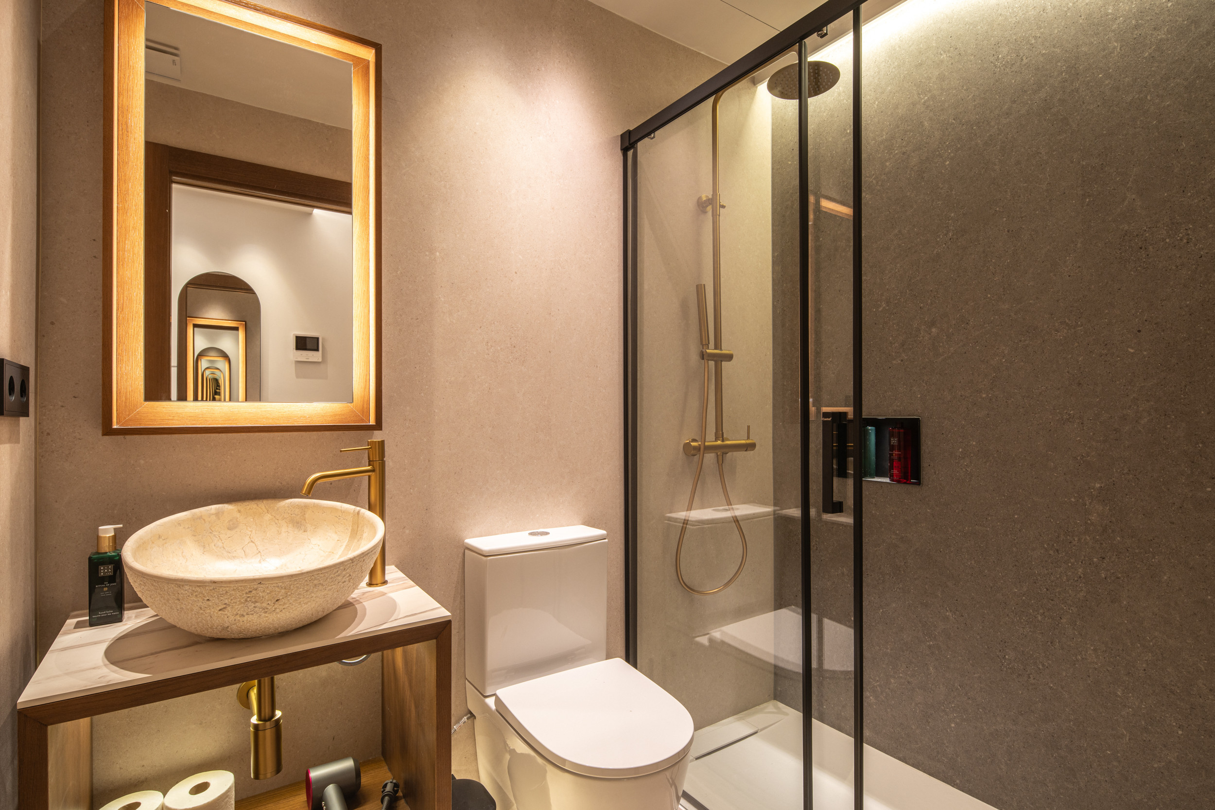 Todos los estudios y apartamentos disponen de un baño privado con ducha con acceso desde dentro de la habitación, así mismo dotamos a los baños de gel y champú de la prestigiosa marca Rituals, kit de papel higiénico de bienvenida, secador, y dispondrás de una toalla de manos y una toalla de cuerpo por persona. También, en las zonas comunes tendrás acceso gratuito a una lavadora y una secadora.