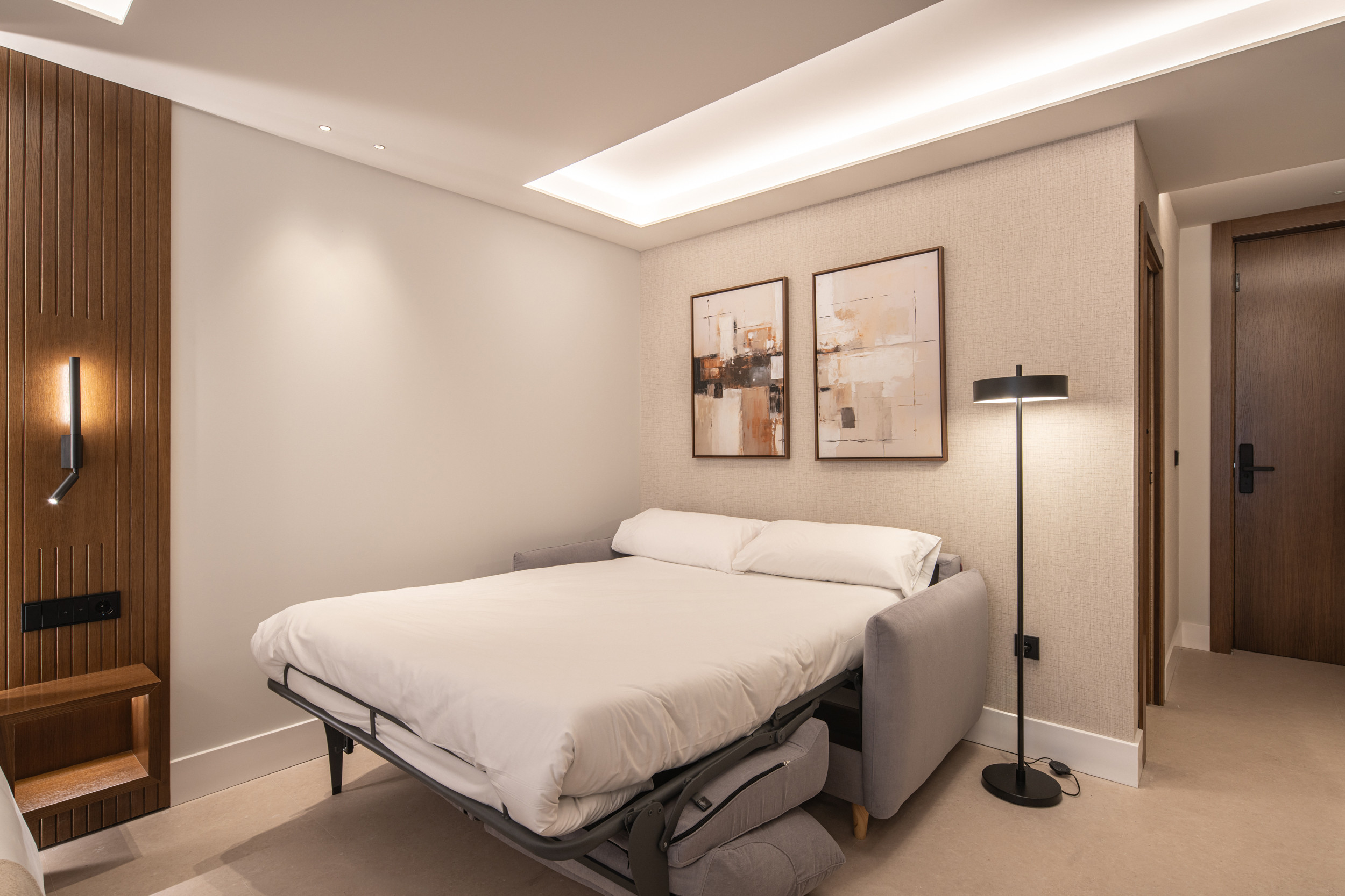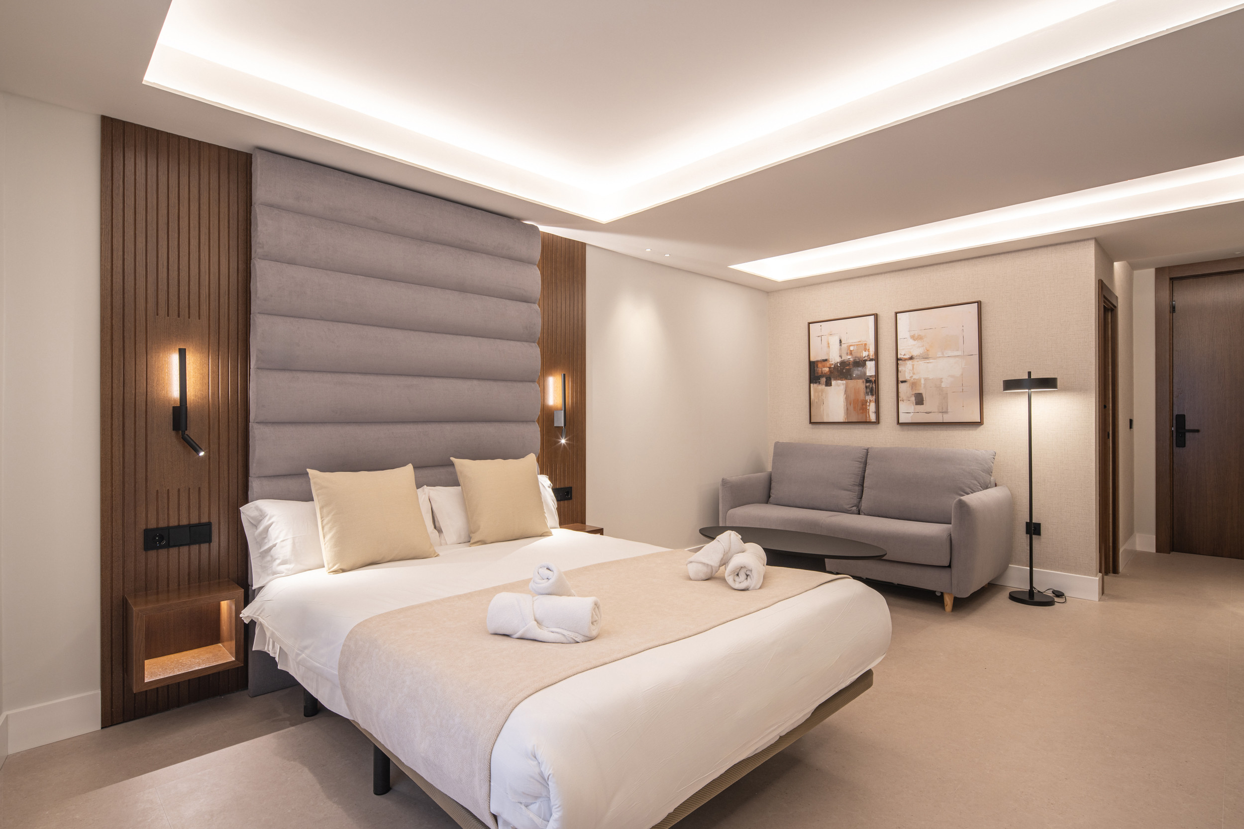 A parte de una cómoda cama, además cuentan con un amplio sofá cama doble de 1.40*2 metros, apto para que incluso dos adultos puedan dormir en él, el tamaño de las camas y distribución de las mismas puede variar en función del apartamento o estudio, podrás informarte mejor dentro la habitación que selecciones, todas disponen de sofá cama excepto el apartamento 3. Este estudio que estás viendo ahora, cuenta con una cama de matrimonio de 1.50*2m más un sofá cama doble.