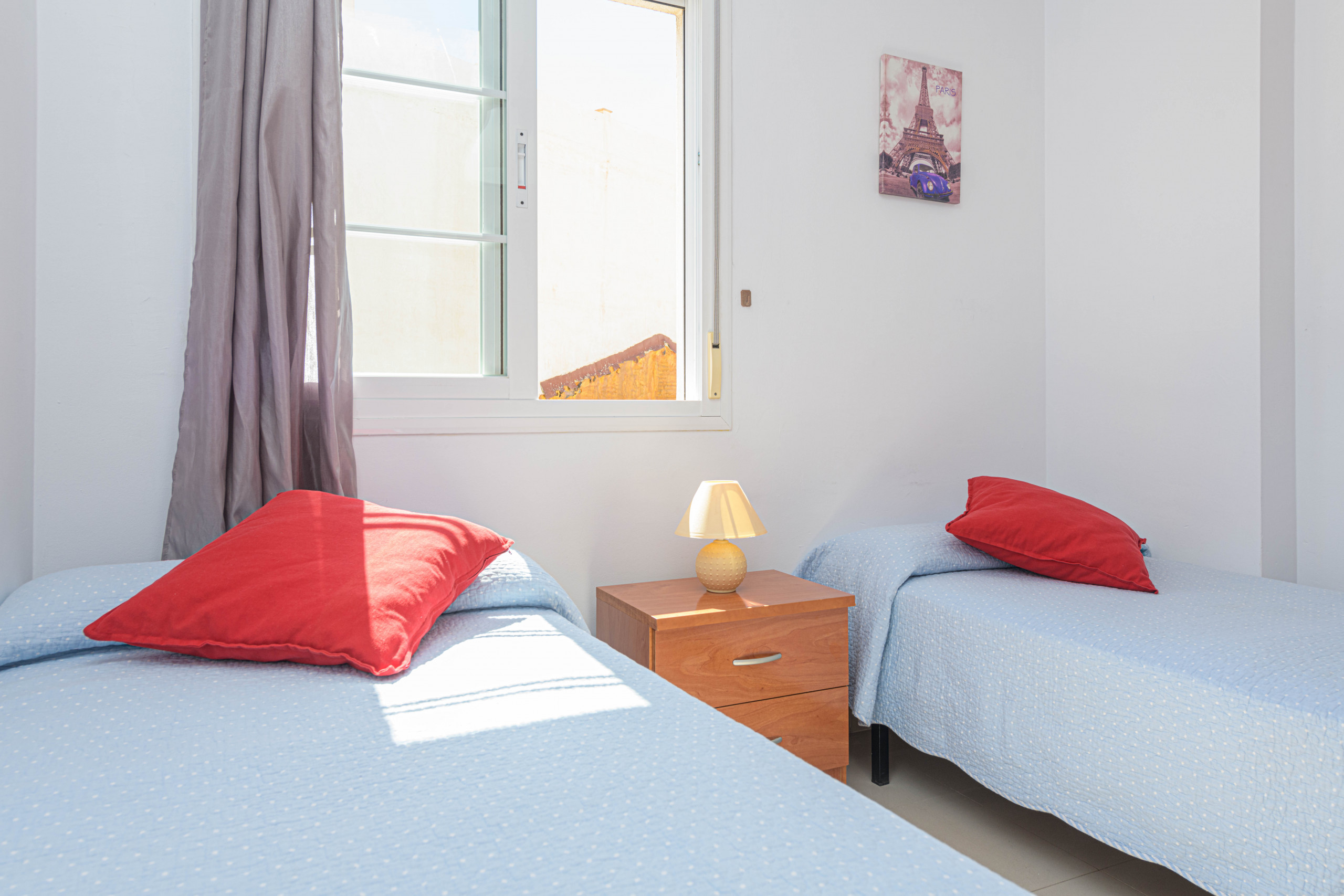 Die Wohnung bietet zwei Schlafzimmer: eines mit einem Doppelbett und ein anderes mit zwei Einzelbetten, beide mit eingebauten Schränken und so gestaltet, dass sie einen komfortablen und erholsamen Schlaf gewährleisten.