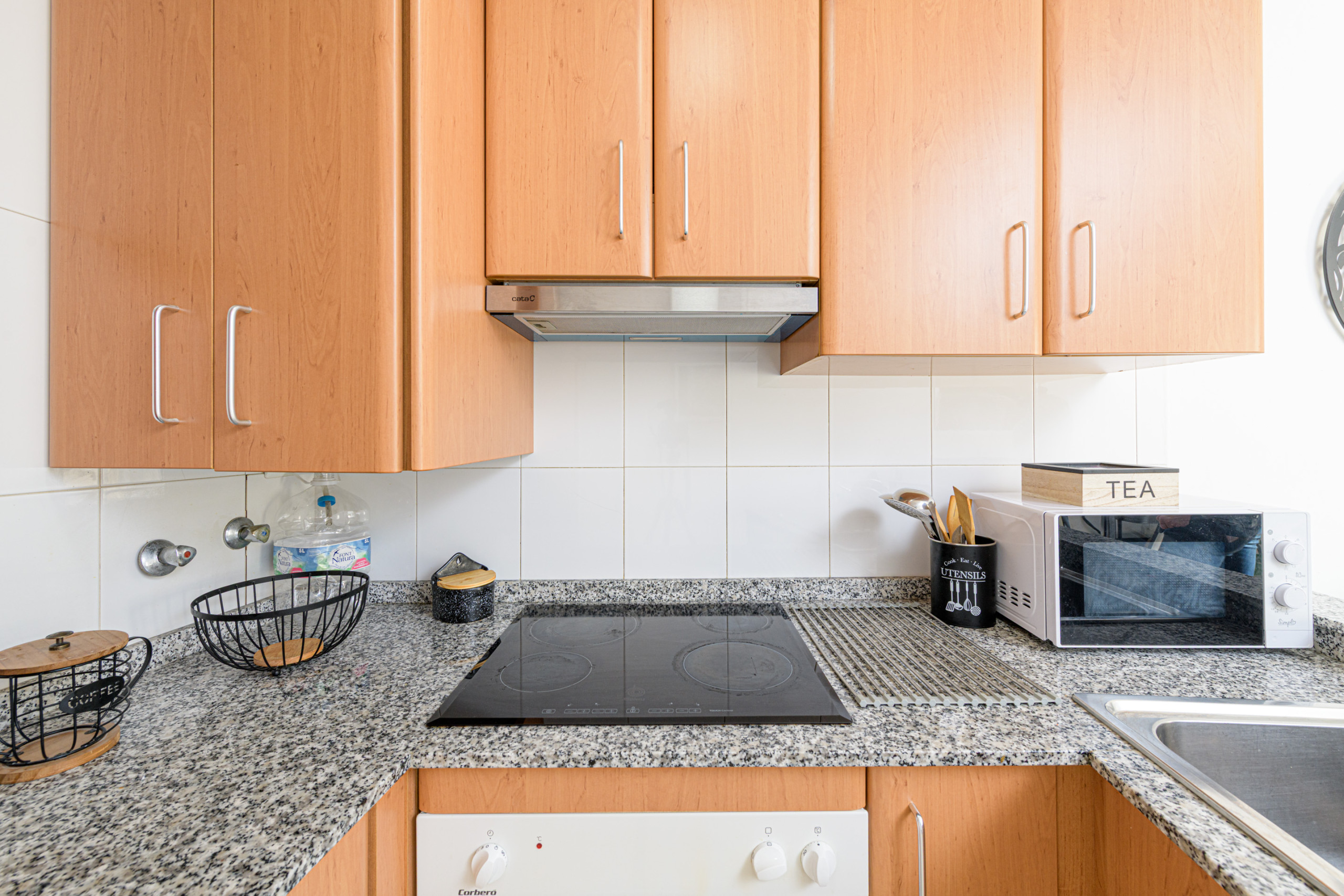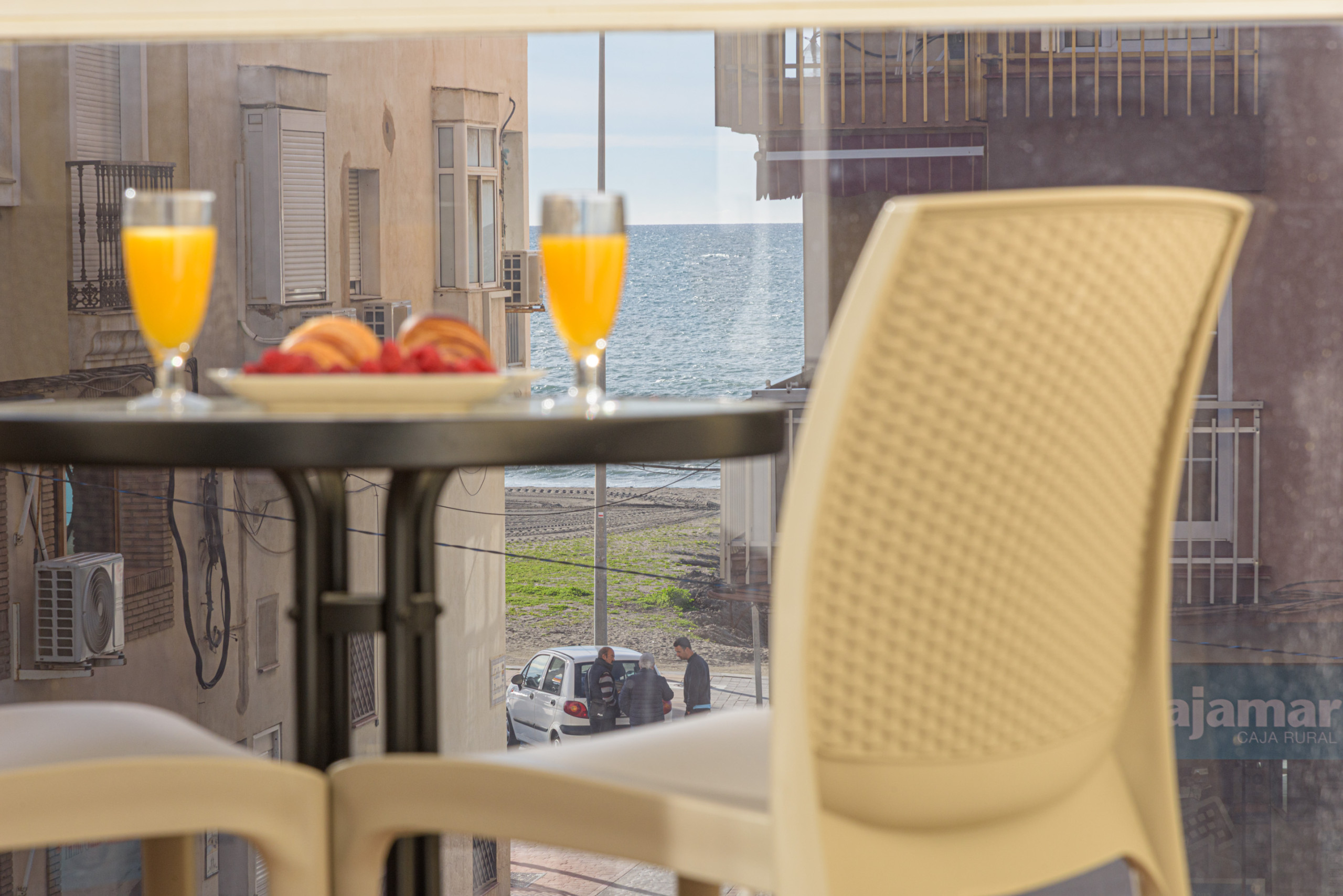 Die Wohnung verfügt über ein gemütliches Wohnzimmer mit Smart-TV, das mit einer voll ausgestatteten offenen Küche verbunden ist, zwei Schlafzimmern und einem modernen Badezimmer mit Dusche. Vom Wohnzimmer aus gelangt man auf eine charmante private Terrasse mit leichtem Meerblick, perfekt zum Entspannen nach einem Tag am Strand.