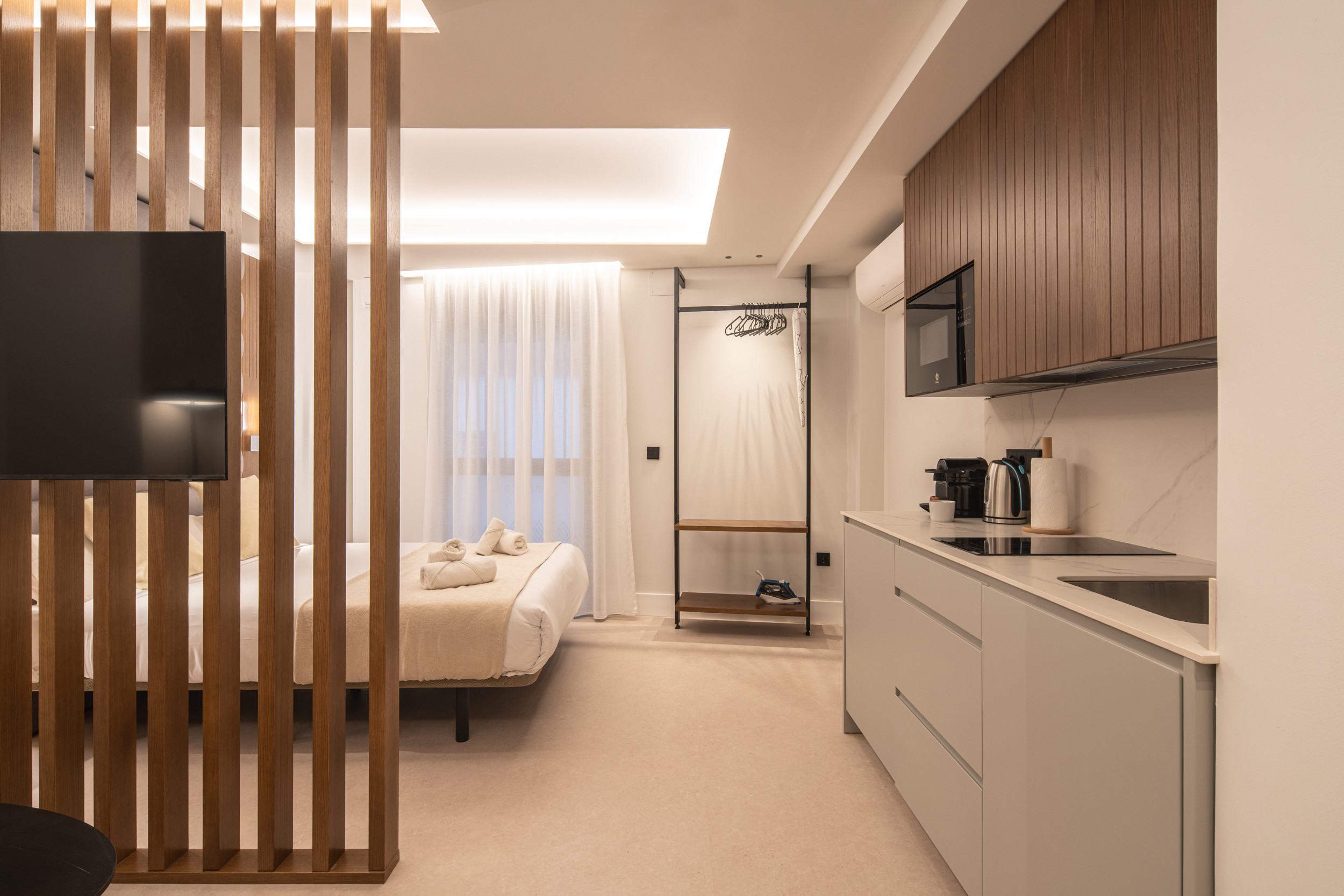 Alle Studien und Apartments verfügen über einen Smart-TV und eine Hochgeschwindigkeits-WLAN-Verbindung, perfekt zum Genießen von Filmen, zum Teilen von Fotos oder um mit Familie und Freunden in Kontakt zu bleiben. Sie können das spanische öffentliche Fernsehen sehen und wenn Sie ein Konto bei Netflix, HBO oder Prime Video haben, können Sie sich während Ihres Aufenthalts mit Ihrem Benutzer anmelden.