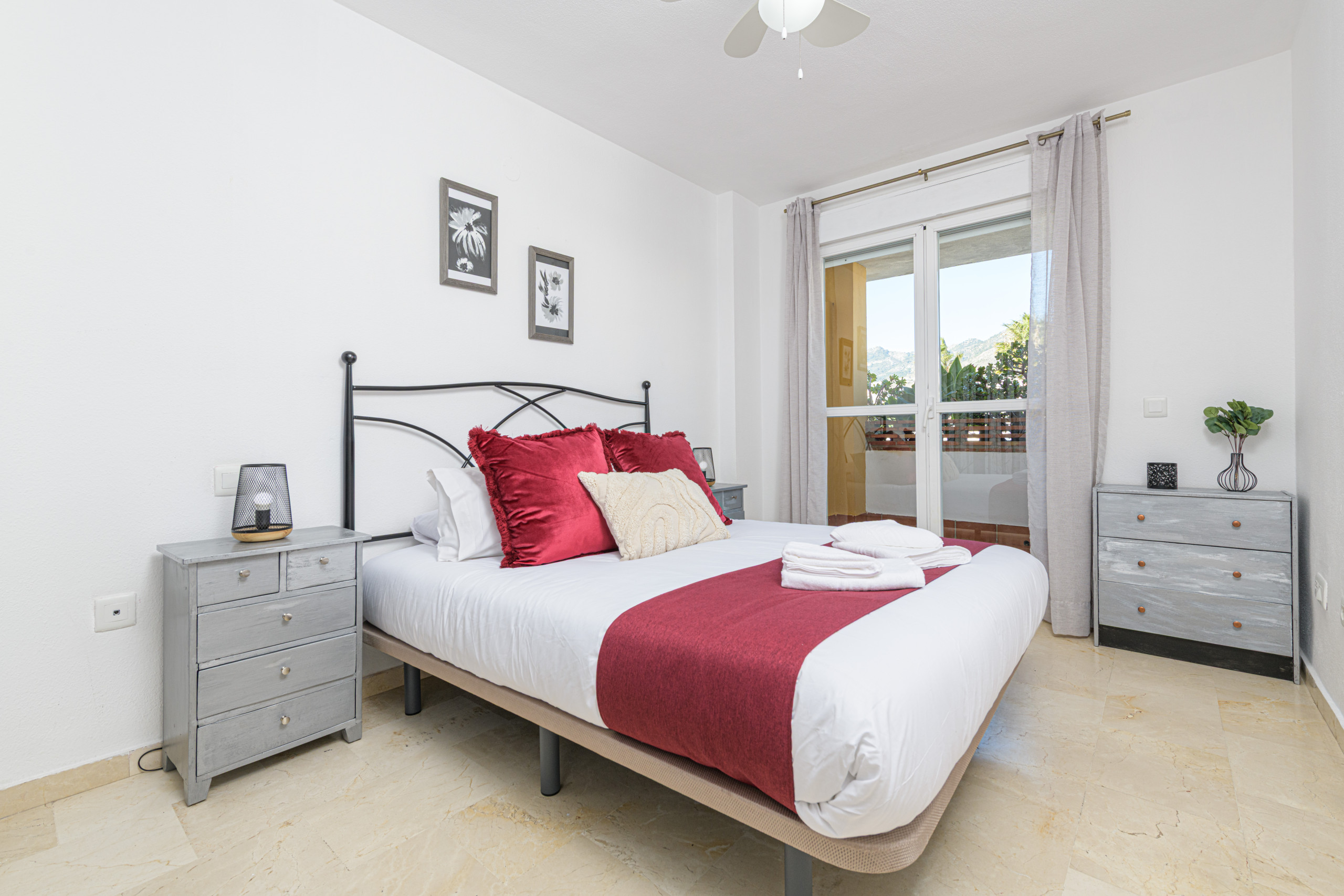 The bedroom, spacious and bright, features a double bed, ceiling fan, and direct access to the terrace, creating an ideal space for relaxation.