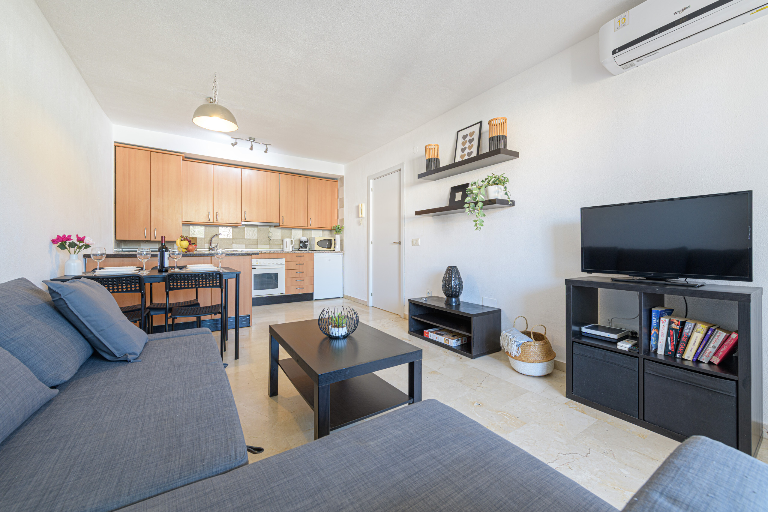 The accommodation features a cosy living-dining room, equipped with a chaise longue sofa that transforms into a sofa bed, television and air conditioning with heating function. From here, you can directly access a spacious terrace, one of the apartment's great attractions, perfect for relaxing, having breakfast outdoors or enjoying the excellent climate all year round.