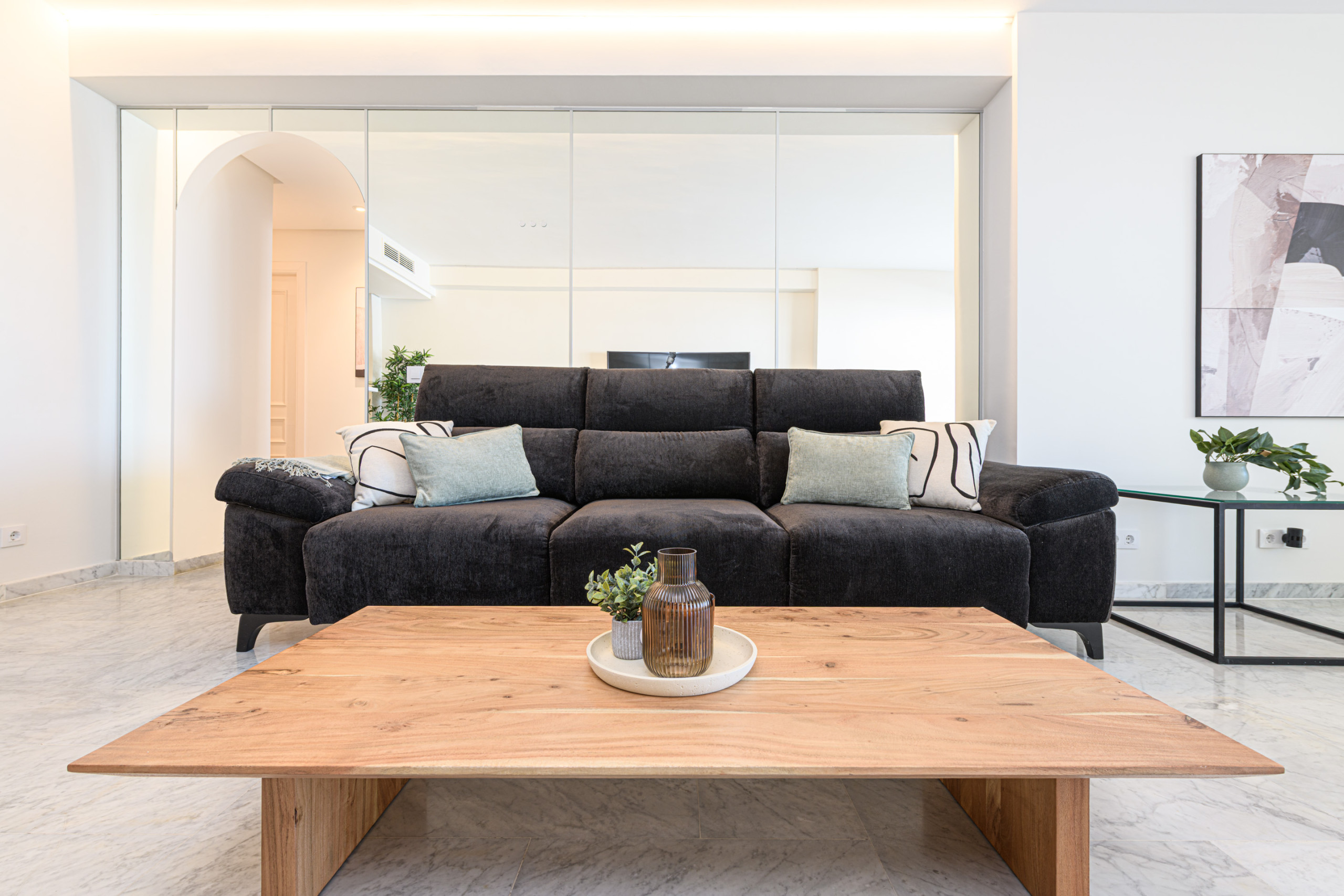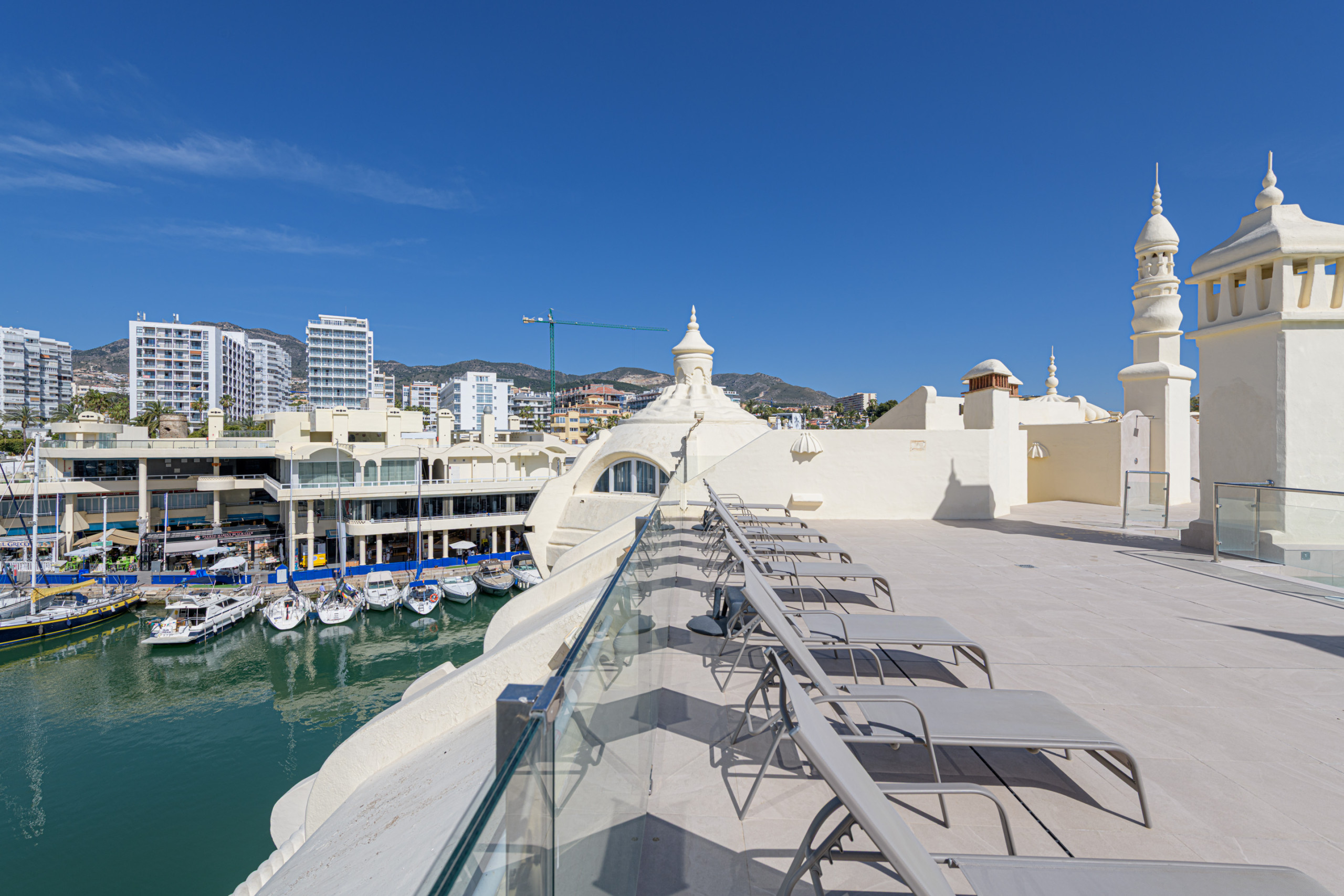 One of the great attractions of the apartment is its spacious glazed terrace with a Lumon system, which allows you to completely open or close the space depending on the time of year, enjoying spectacular views of Puerto Marina and the Ferris wheel in any season. It is equipped with a dining table and outdoor furniture to sit comfortably, which allows you to enjoy breakfasts facing the sea, family meals or dinners at sunset with the illuminated port as a backdrop, with total comfort and protection from the wind. In addition, the terrace has its own Smart TV, perfect for enjoying a movie or a sporting event while contemplating the views.