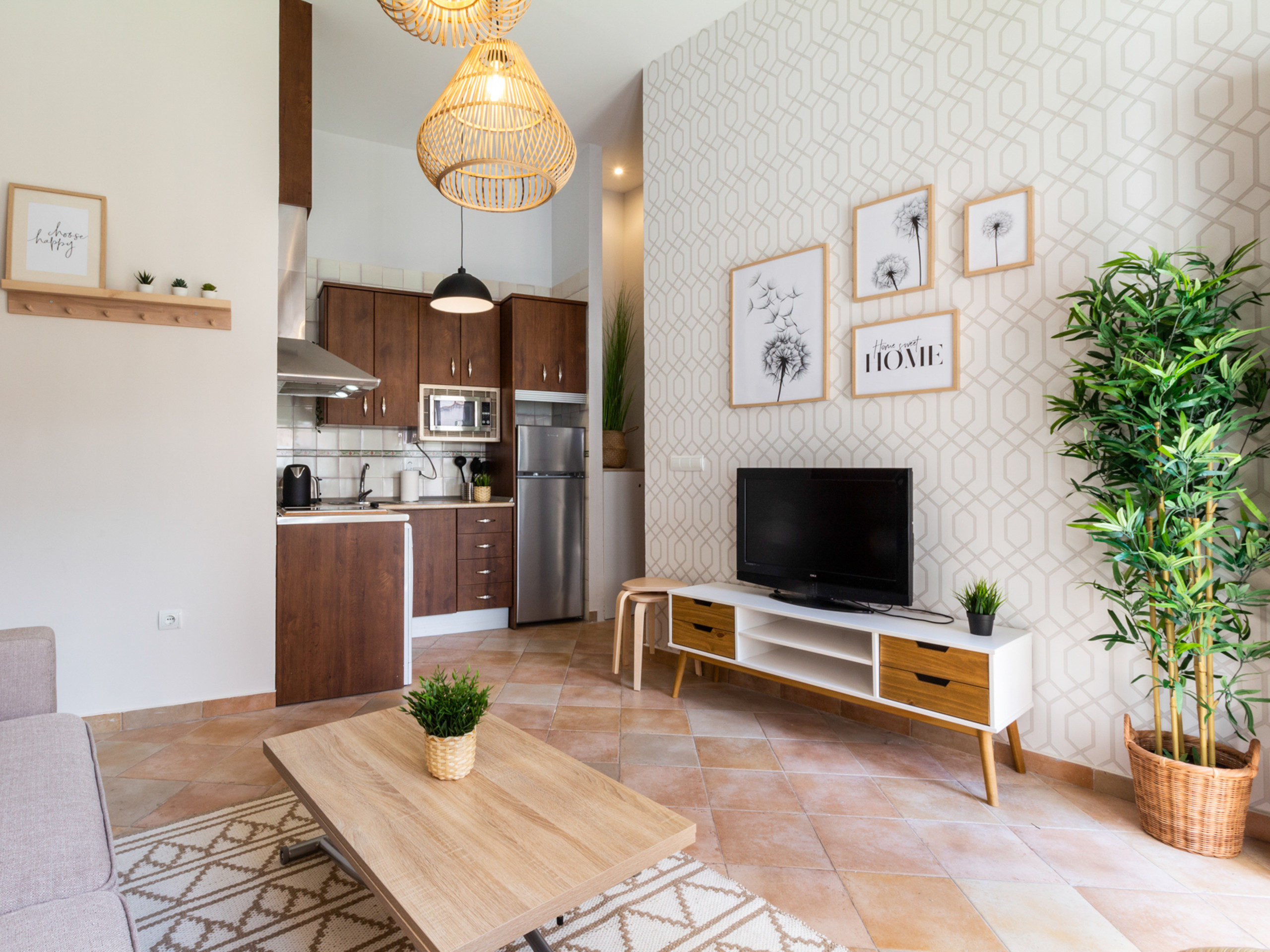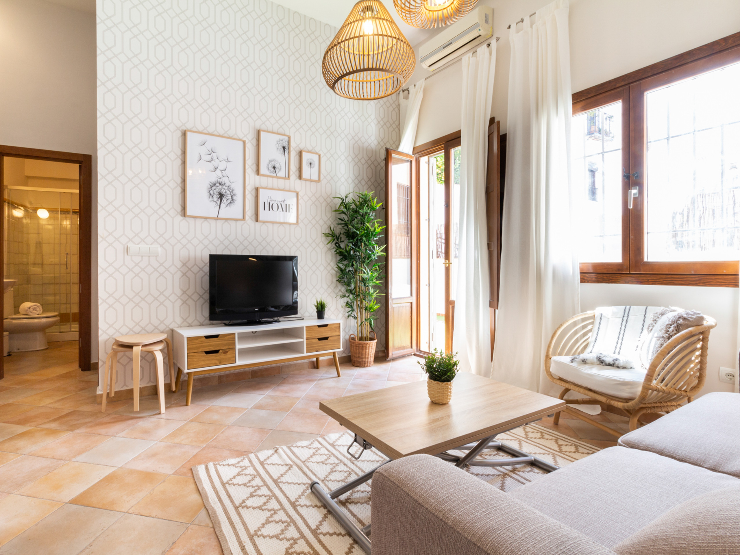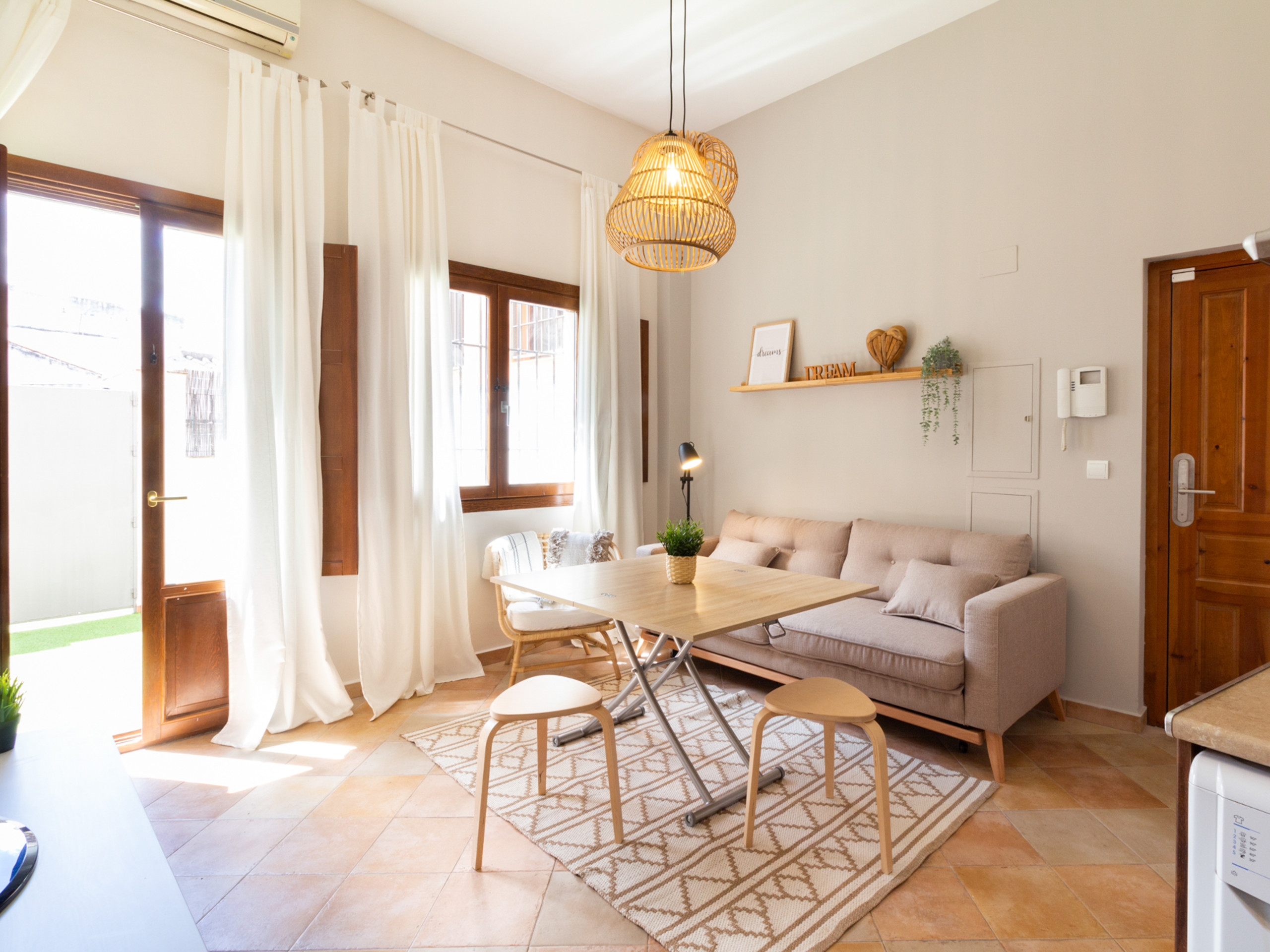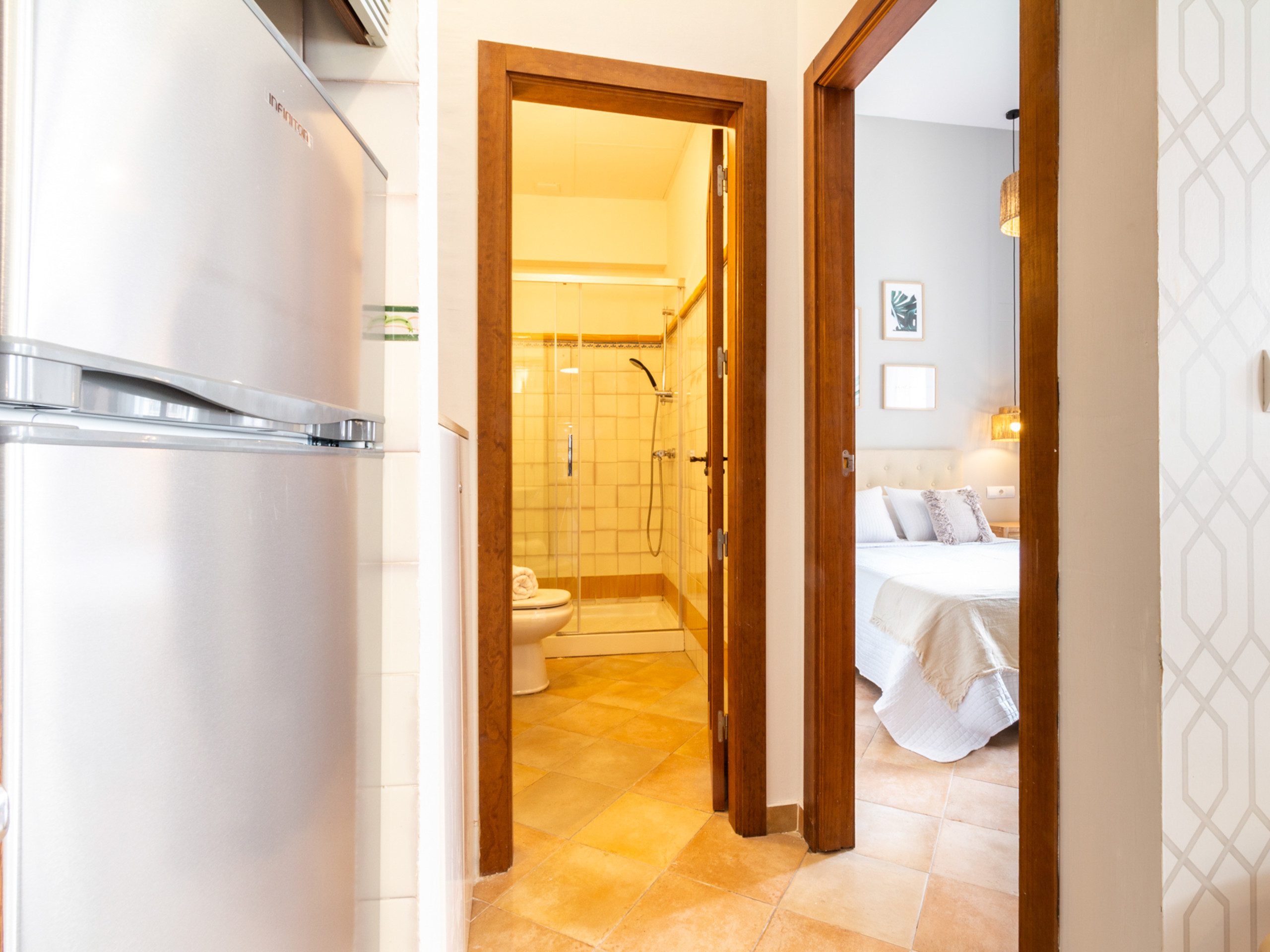 The great value of the apartment is its pleasant private terrace, perfect for enjoying breakfasts in the sun or outdoor dinners with views of the charming Andalusian courtyard of the building, a quiet and very photogenic space. The building has a lift, autonomous arrival via keyboard lock and the possibility of a cot, which makes it ideal for both romantic getaways and family stays.