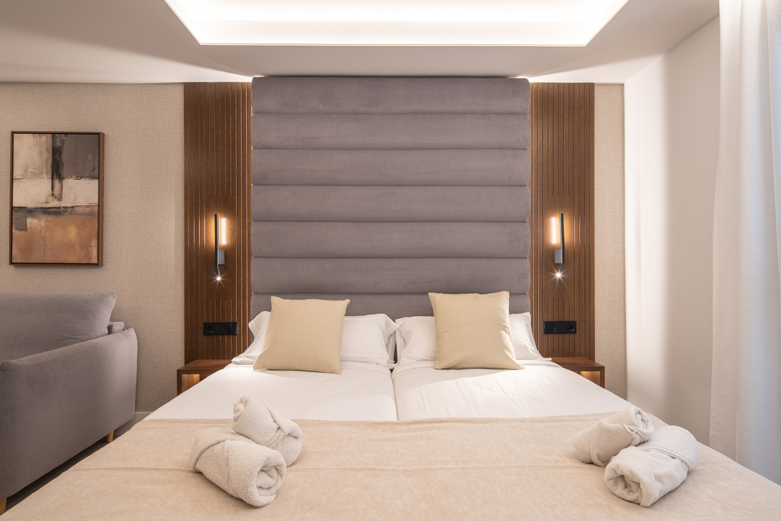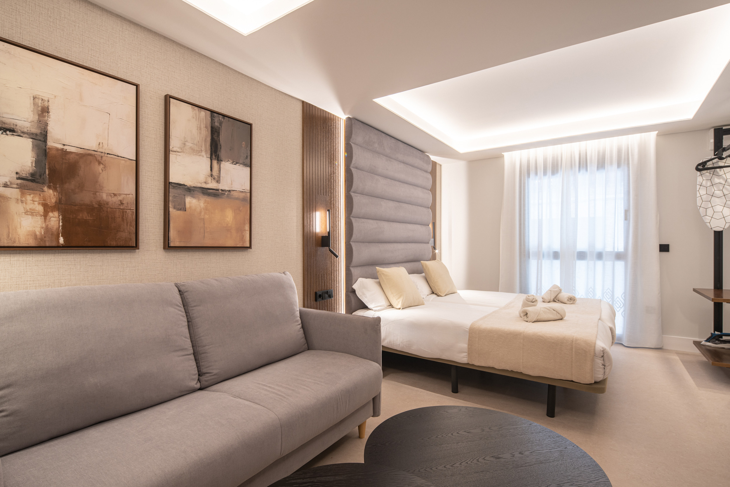 Apart from a comfortable bed, they also have a spacious double sofa bed of 1.40*2 metres, suitable for even two adults to sleep in, the size of the beds and their distribution may vary depending on the apartment or studio, you can get better information inside the room you select, all have sofa beds except apartment 3. This studio you are looking at now has a double bed of 1.50*2m plus a double sofa bed.