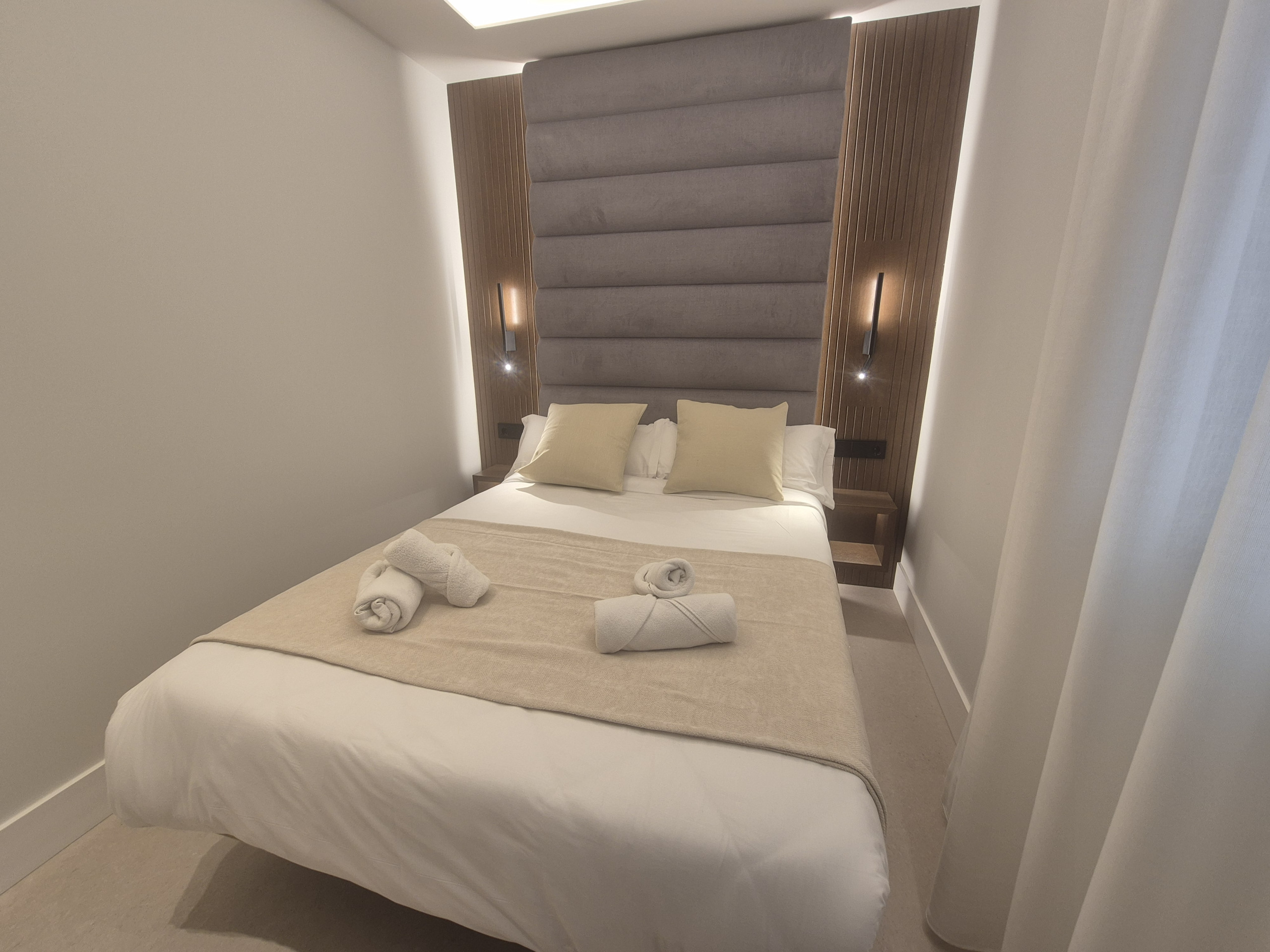 Apart from a comfortable bed, they also have a spacious double sofa bed of 1.40*2 metres, suitable for even two adults to sleep in, the size of the beds and their distribution may vary depending on the apartment or studio, you can get better information inside the room you select, all have sofa beds except apartment 3. This studio you are looking at now has a double bed of 1.50*2m plus a double sofa bed.