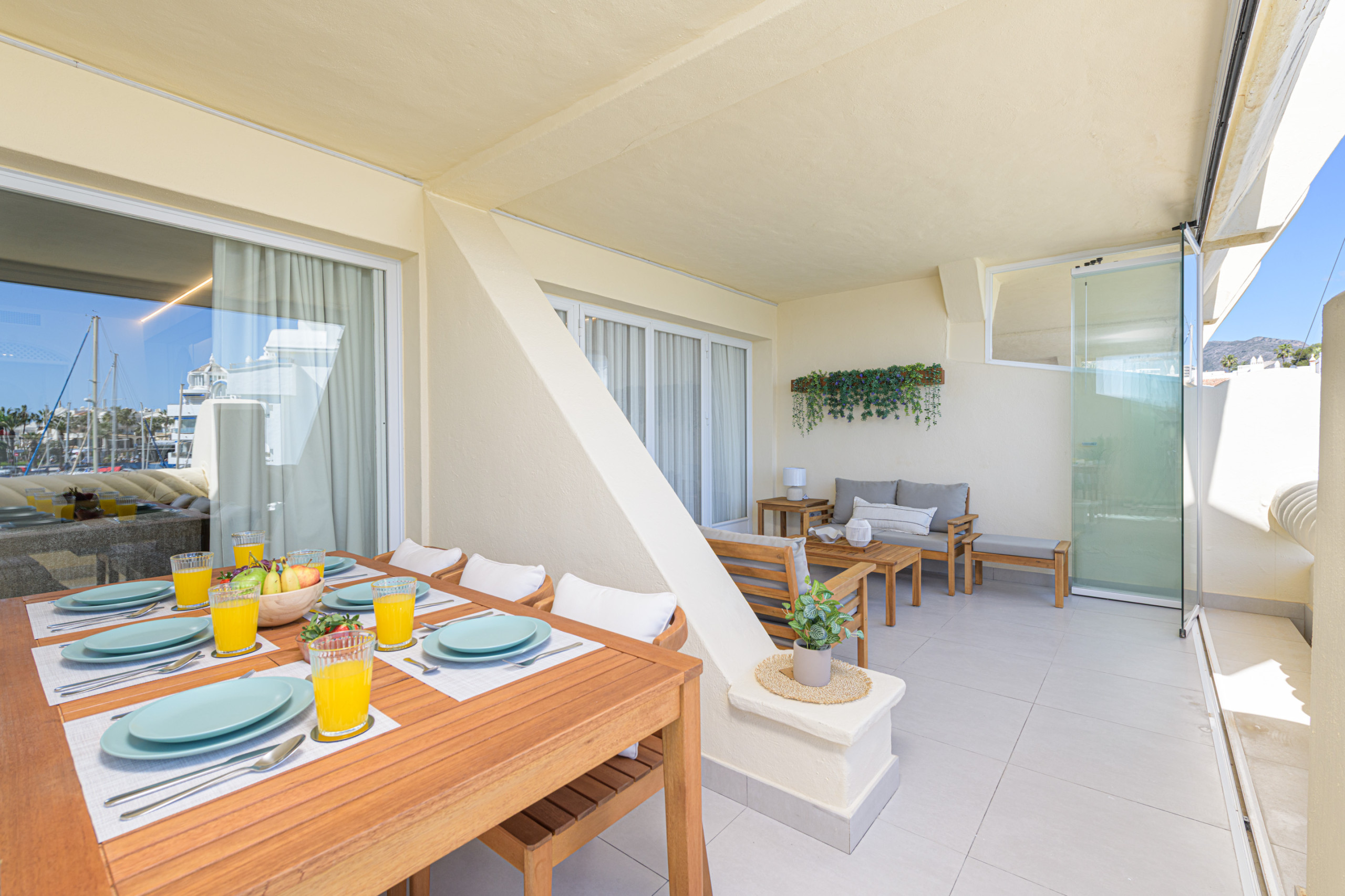 L'un des grands attraits de l'appartement est sa large terrasse vitrée avec système Lumon, qui permet d'ouvrir ou de fermer complètement l'espace selon la saison, profitant de vues spectaculaires sur Puerto Marina et la grande roue à toute saison. Elle est équipée d'une table à manger et de mobilier extérieur pour s'asseoir confortablement, ce qui permet de profiter de petits-déjeuners face à la mer, de repas en famille ou de dîners au coucher du soleil avec le port illuminé comme toile de fond, avec tout le confort et la protection contre le vent. De plus, la terrasse dispose de sa propre Smart TV, parfaite pour profiter d'un film ou d'un événement sportif tout en contemplant les vues.