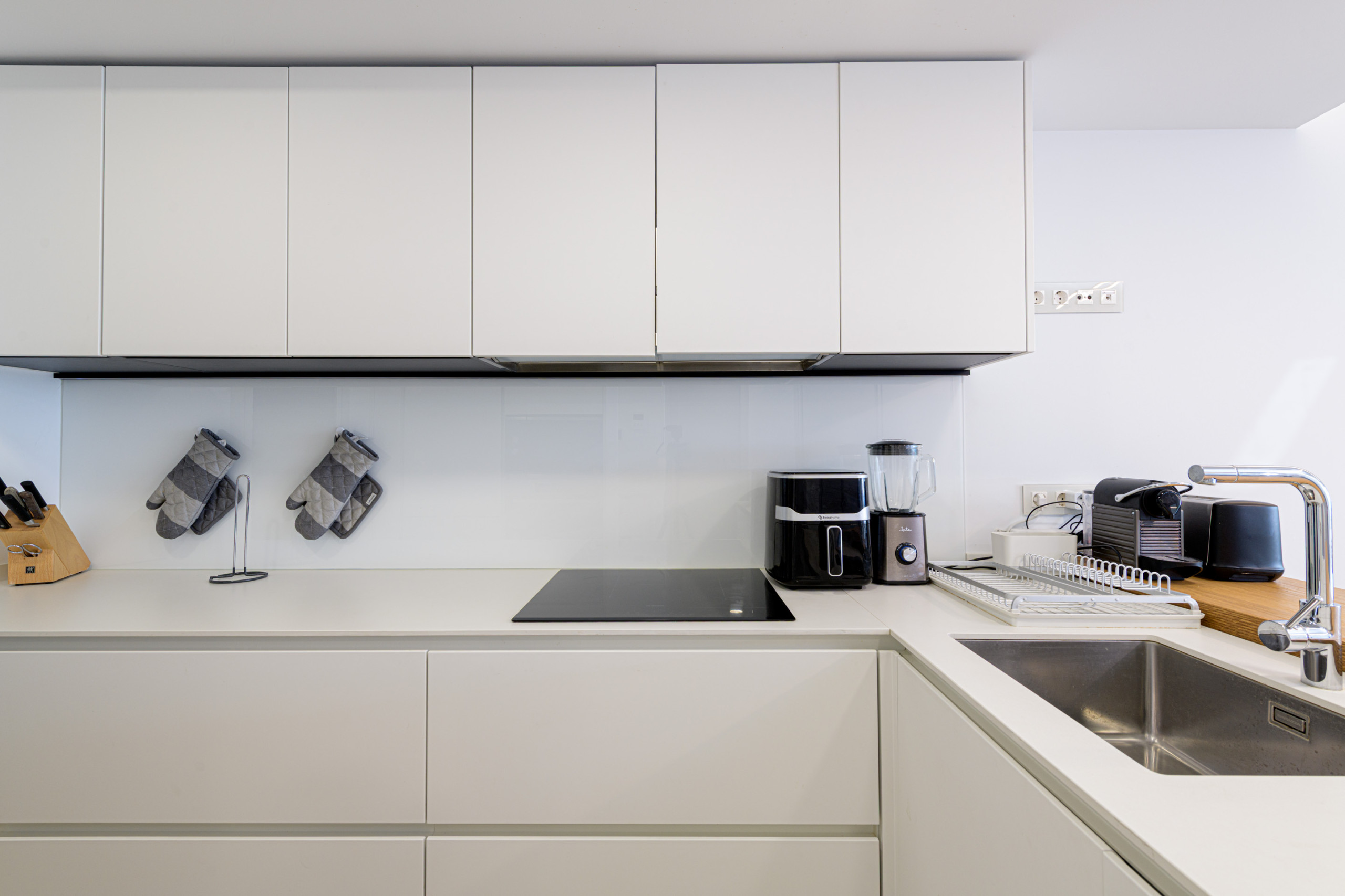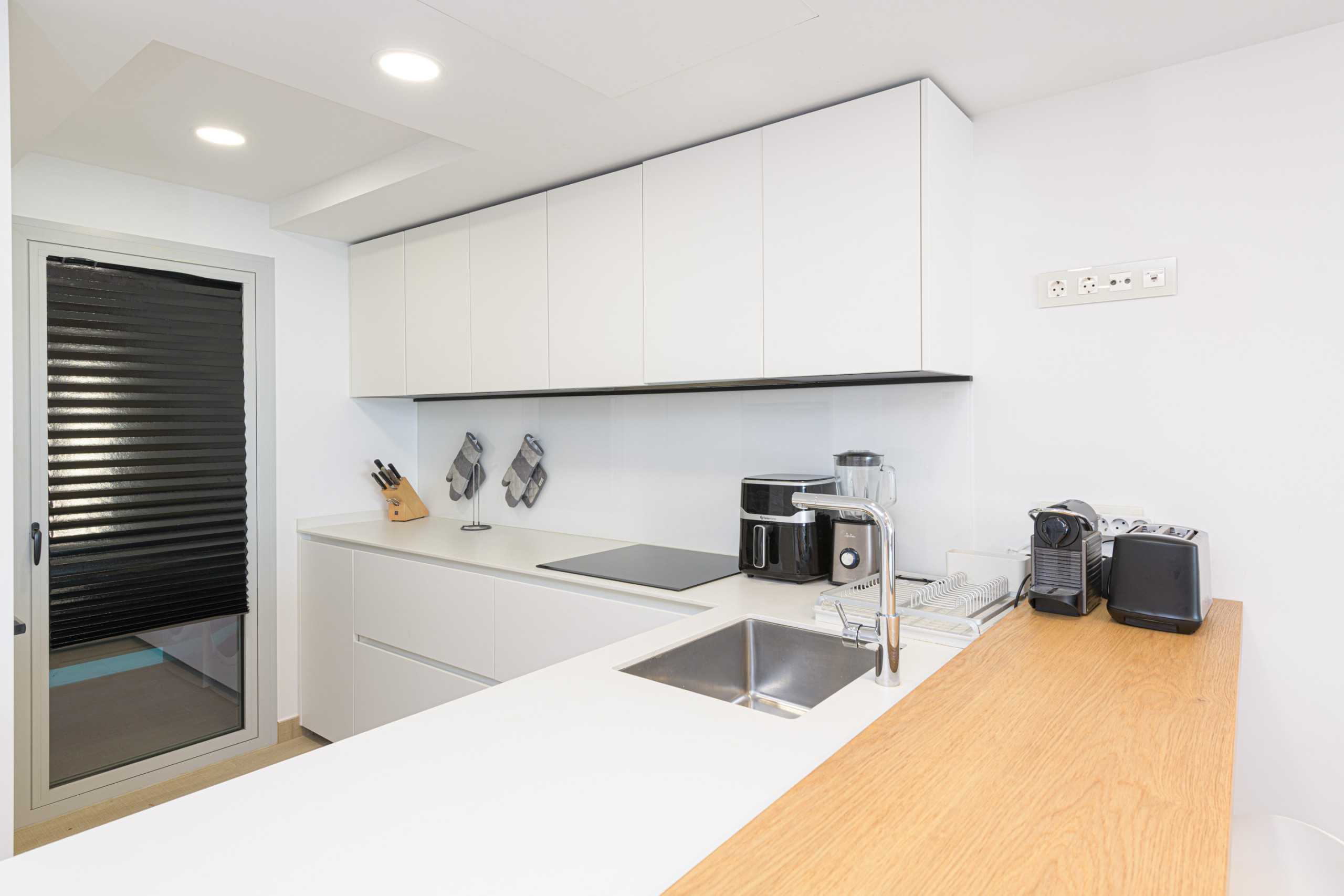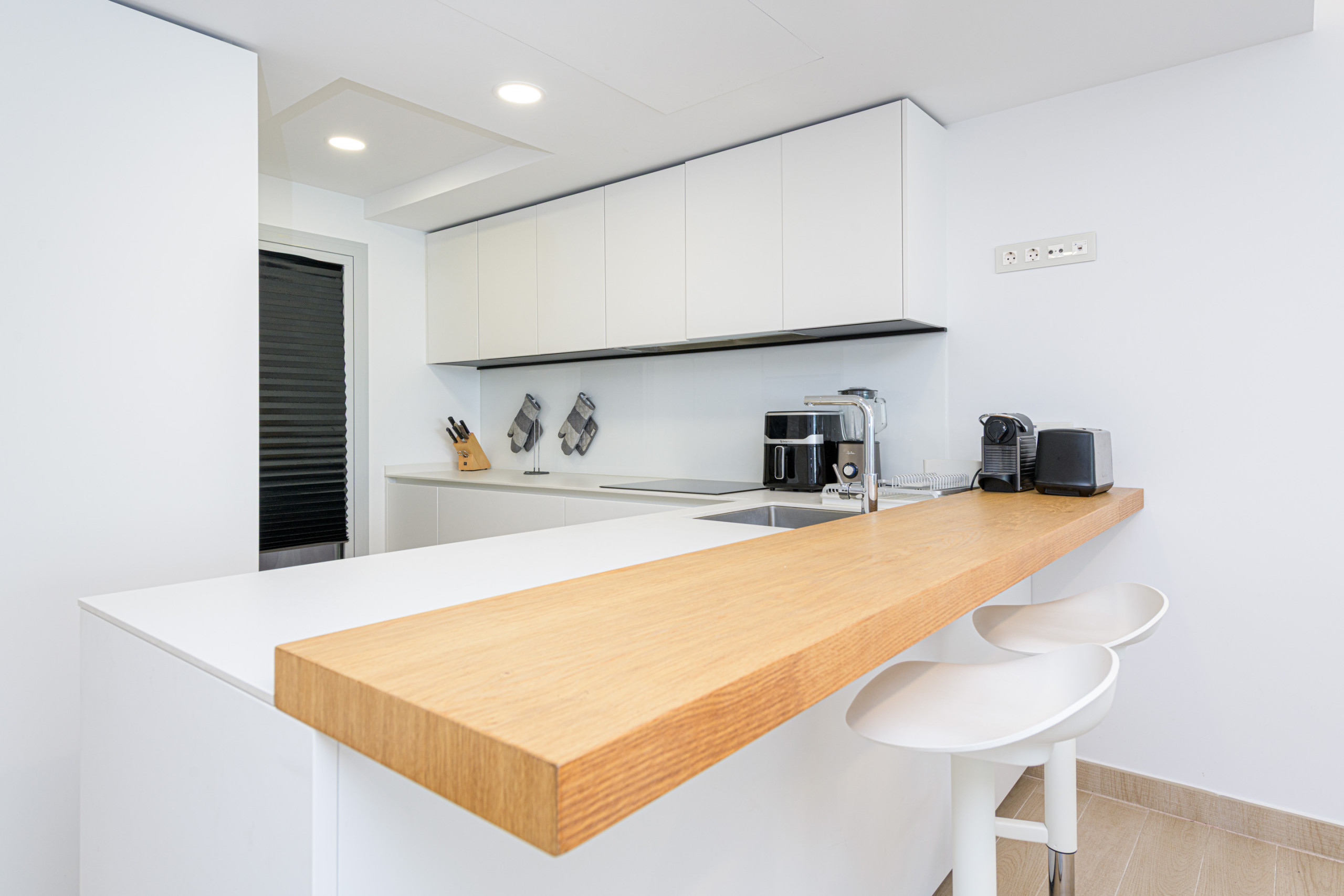 Le salon, moderne et très lumineux, s'intègre avec une cuisine entièrement équipée d'électroménagers de haute qualité, idéal pour préparer des repas et profiter d'un séjour confortable et pratique.