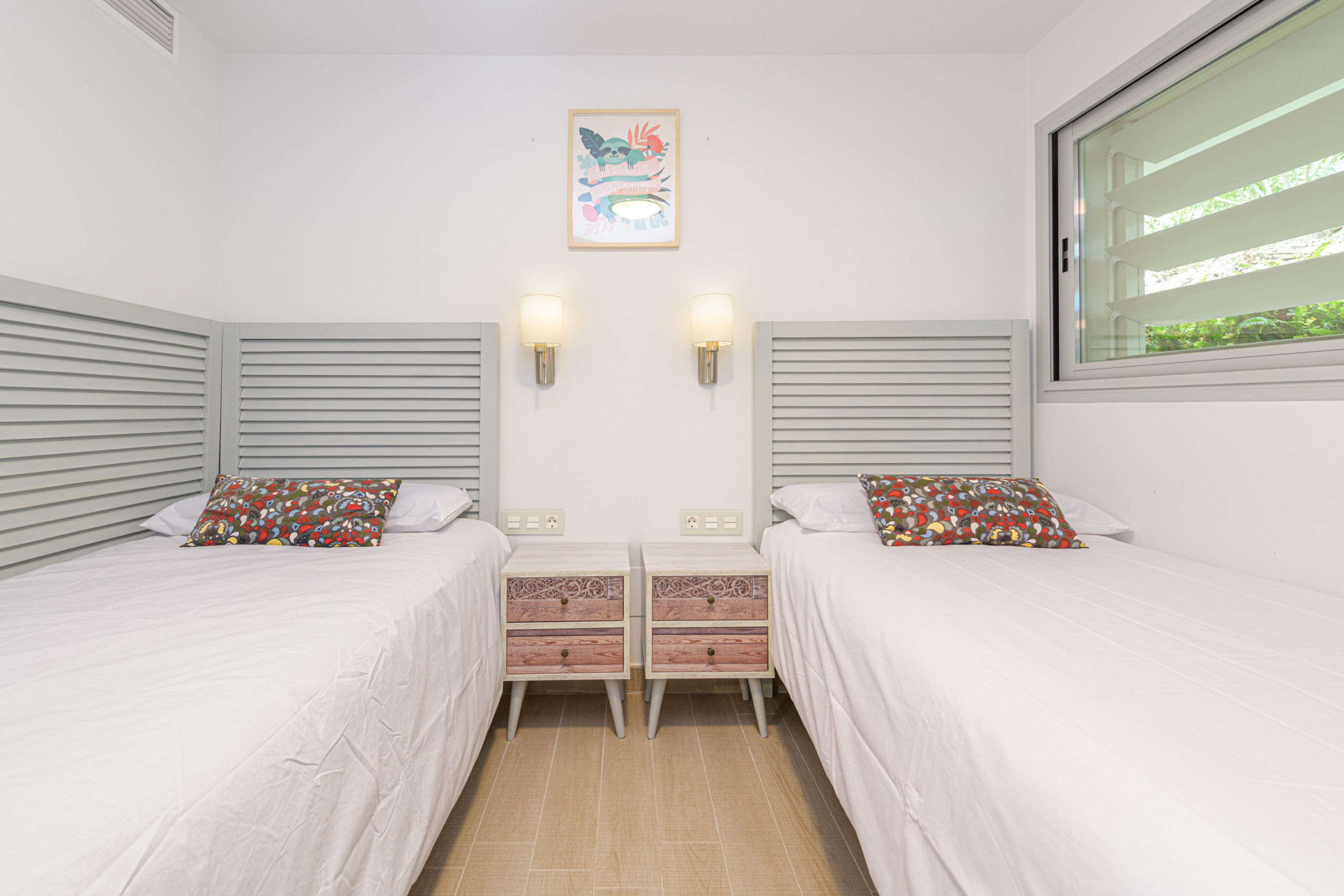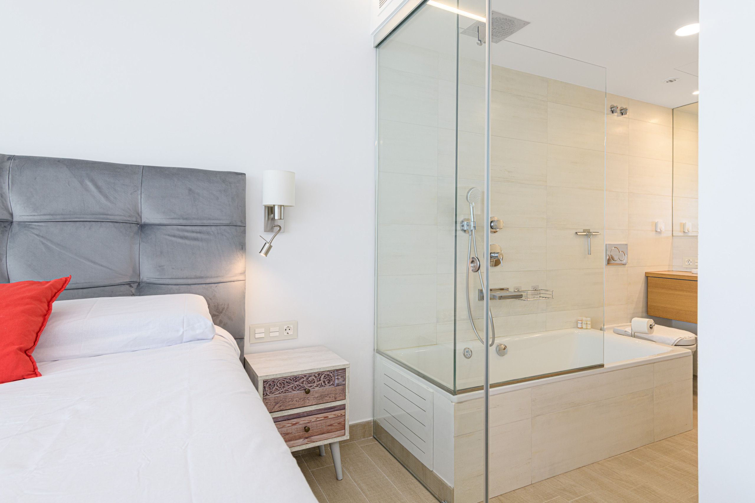 Le logement dispose de deux chambres, toutes deux spacieuses et confortables. La chambre principale est équipée d'un lit king-size, d'une salle de bain attenante et d'un accès direct à la terrasse, créant un espace intime et très relaxant. La deuxième chambre est équipée de deux lits individuels. L'appartement dispose d'une deuxième salle de bain indépendante, garantissant intimité et confort pour tous les invités.
