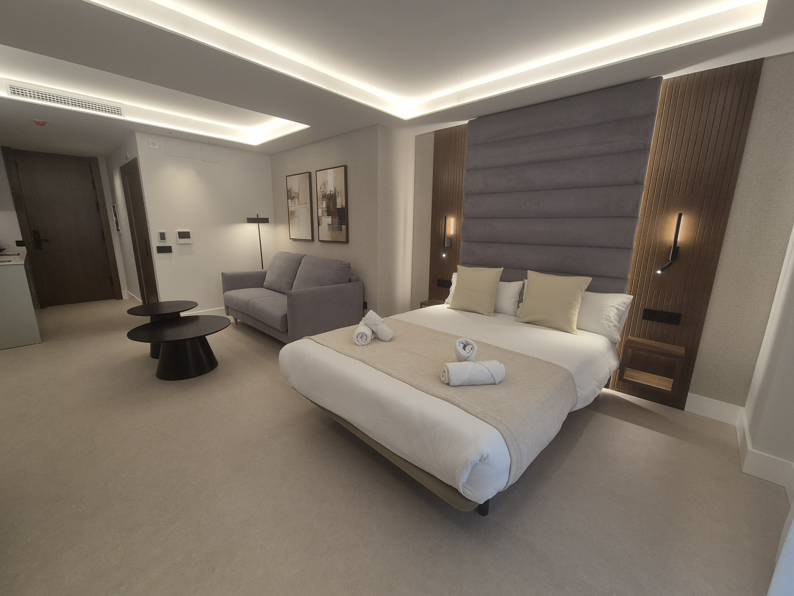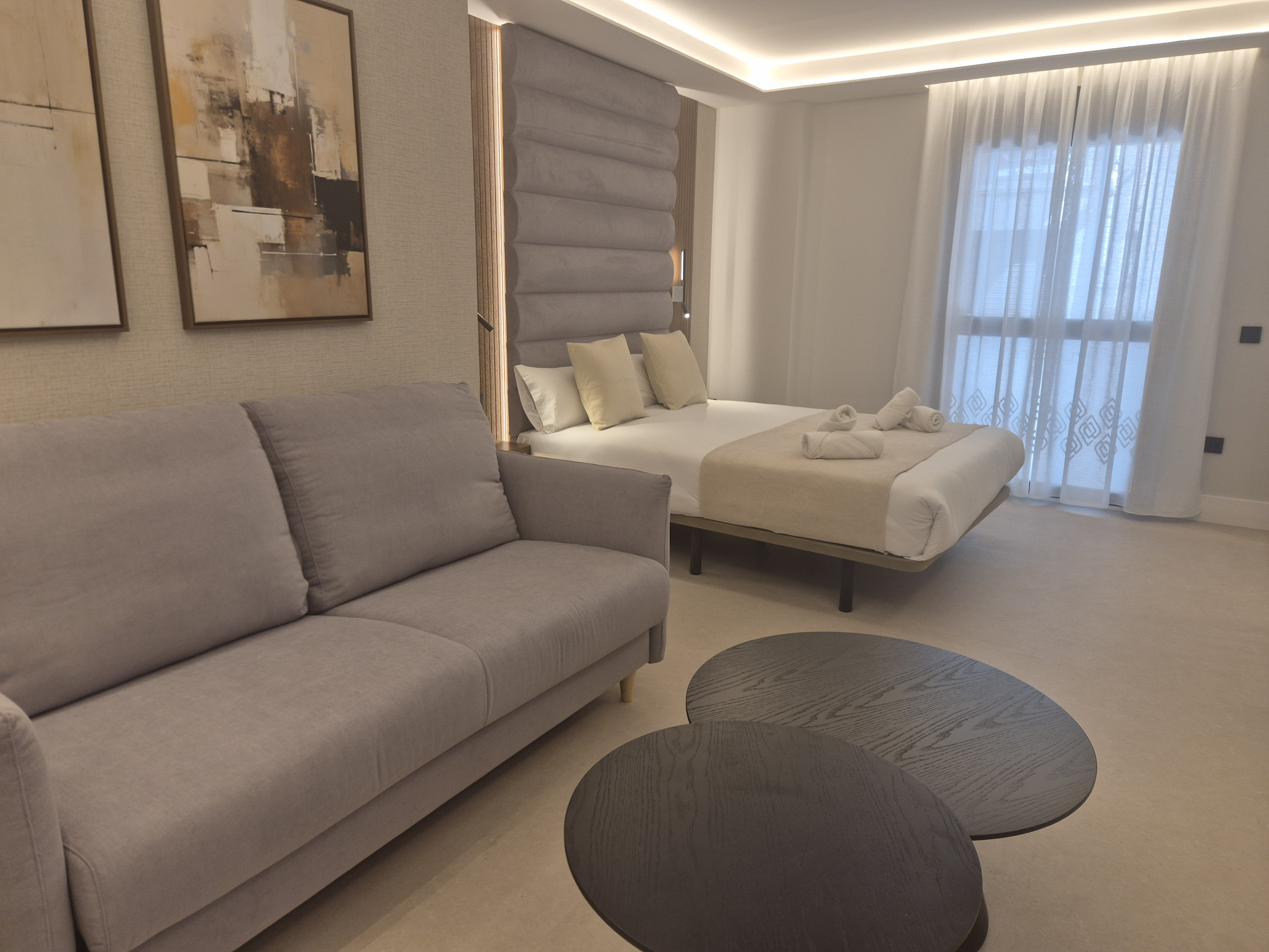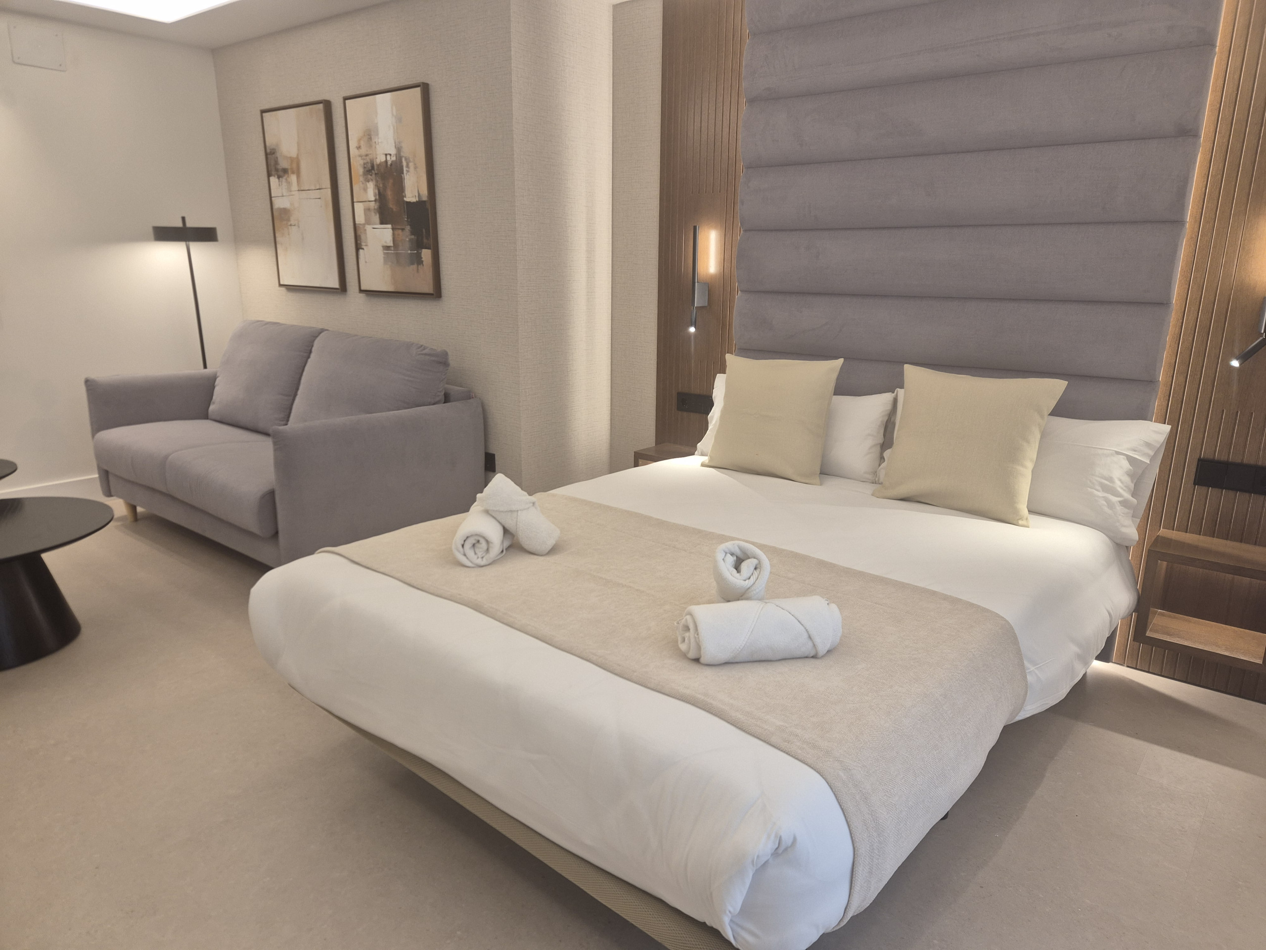 Mis à part un lit confortable, ils disposent également d'un grand canapé-lit double de 1,40*2 mètres, adapté pour que deux adultes puissent même y dormir, la taille des lits et leur disposition peuvent varier selon l'appartement ou le studio, vous pourrez vous informer plus précisément dans la chambre que vous choisirez, tous disposent d'un canapé-lit à l'exception de l'appartement 3. Ce studio que vous regardez maintenant, dispose d'un lit de mariage de 1,50*2m plus un canapé-lit double.
