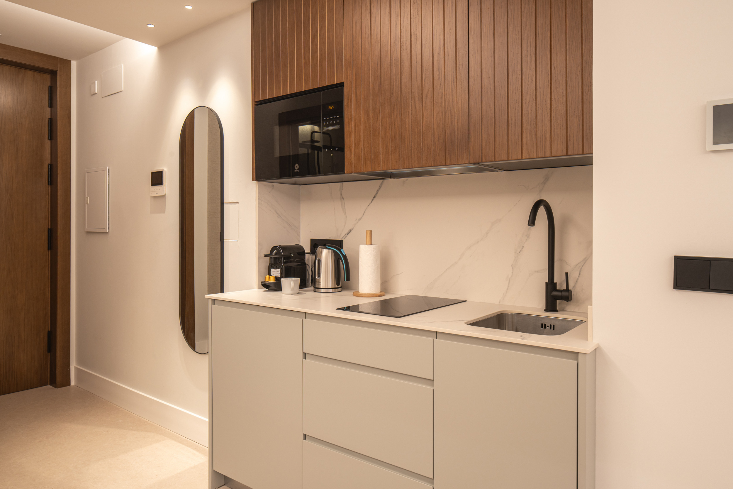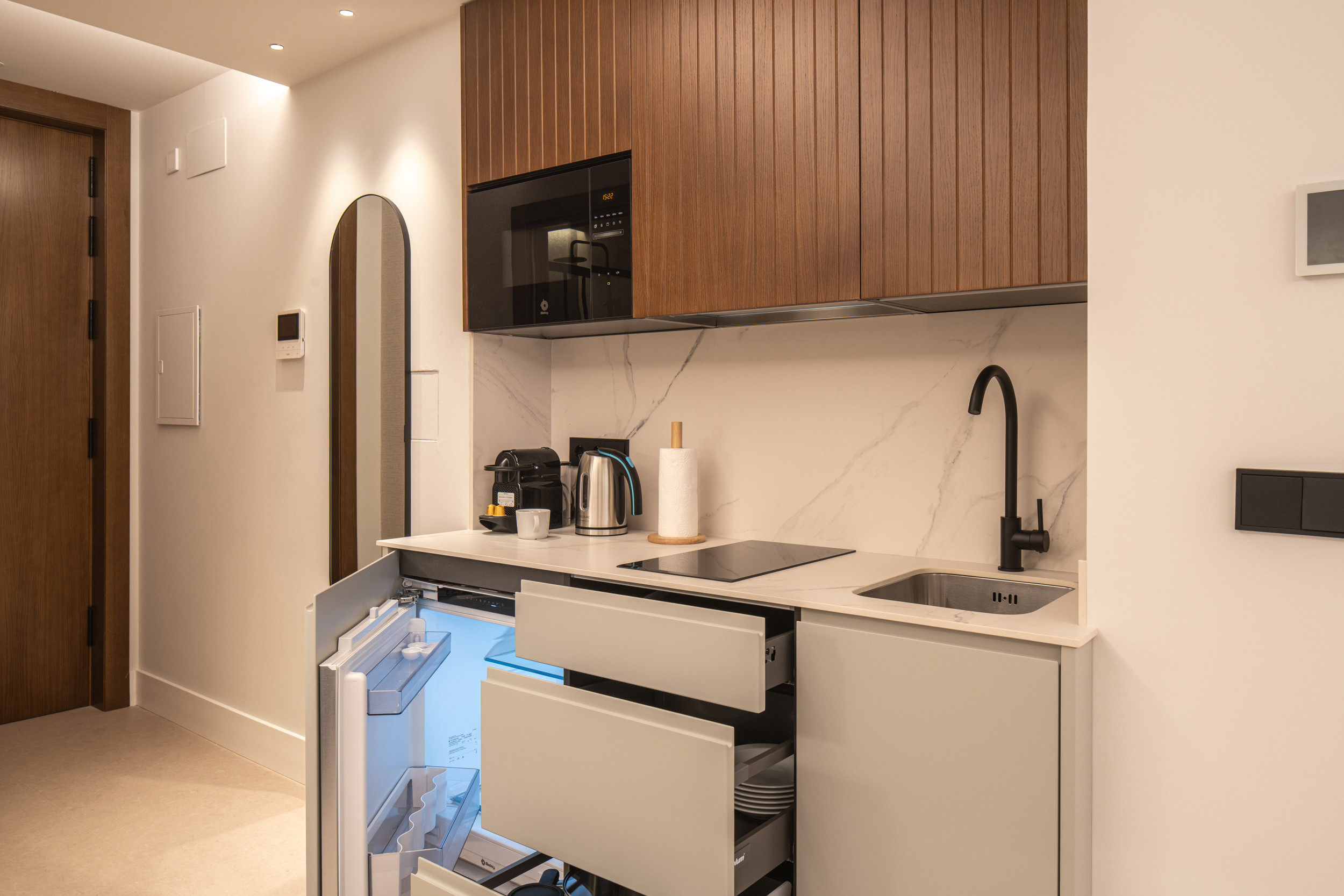 Tous les studios et appartements sont équipés d'une vaisselle de cuisine complète, de micro-ondes, de réfrigérateur (réfrigérateur uniquement), de plaque de cuisson à induction, et d'une hotte aspirante, afin que vous puissiez cuisiner pendant votre séjour et vous sentir comme ez chez vous.