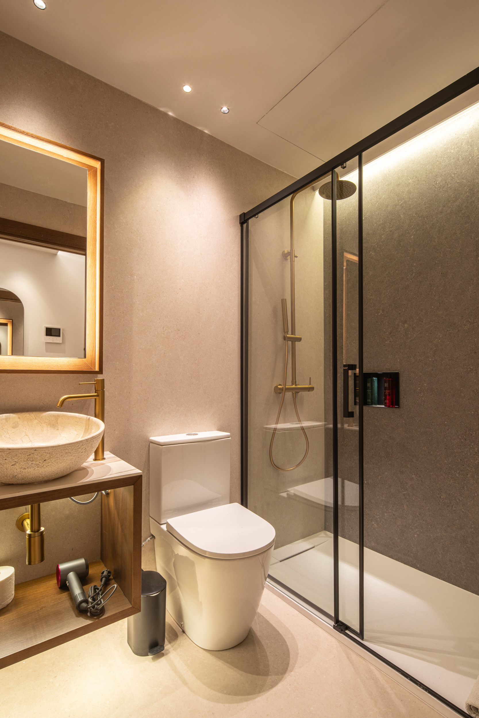 Toutes les études et tous les appartements disposent d'une salle de bain privative avec douche accessible depuis l'intérieur de la chambre. De plus, nous équipons les salles de bain de gel et de shampooing de la prestigieuse marque Rituals, d'un kit de papier toilette de bienvenue, d'un sèche-cheveux, et vous disposerez d'une serviette de main et d'une serviette de corps par personne. Également, dans les espaces communs, vous aurez un accès gratuit à un lave-linge et un sèche-linge.